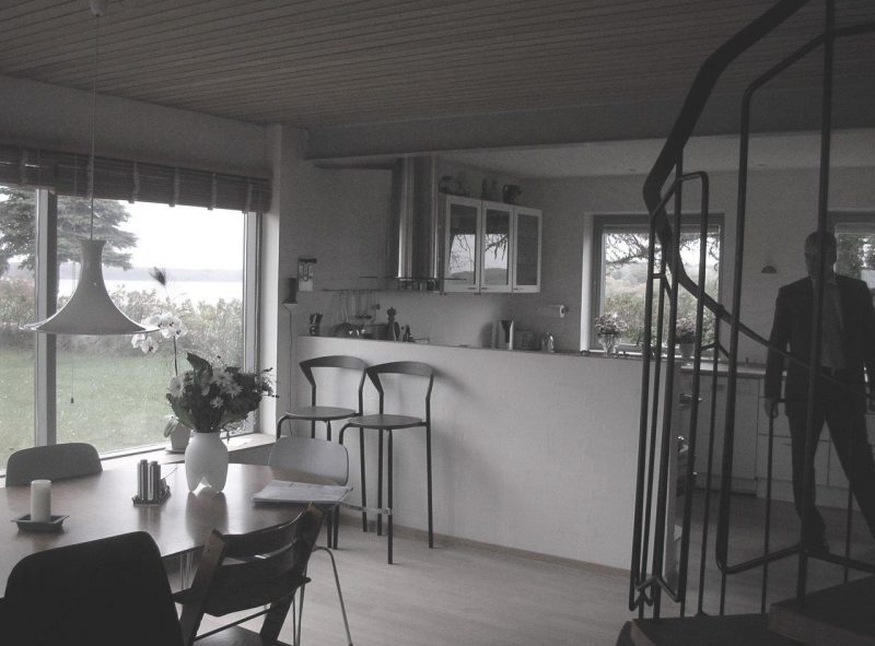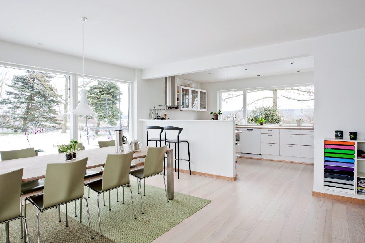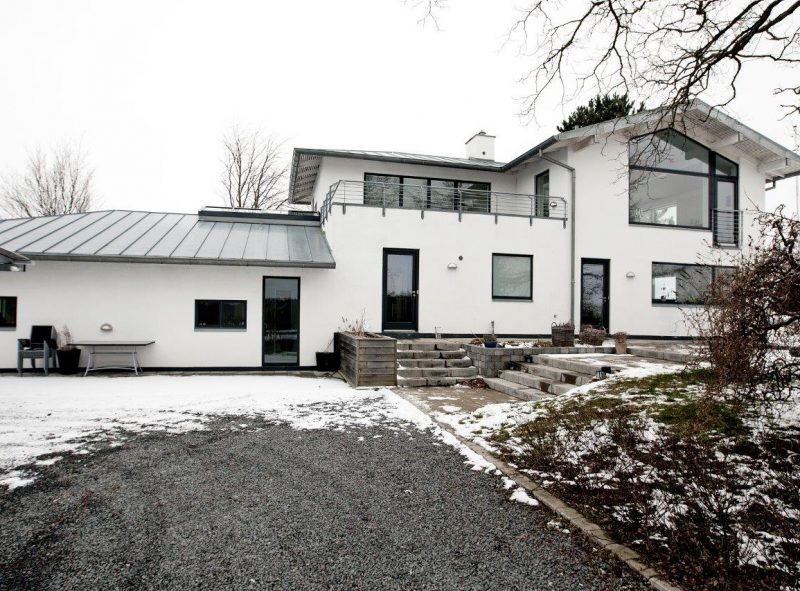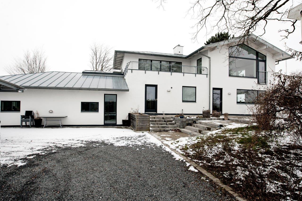 Om- og tilbygningen er udført efter gældende BR-krav. Taget med Plannja Pandeplader er efterisoleret, mens døre og vinduespartier fra VELFAC opfylder tidens bedste energikrav. Brændeovnsindsatser er fra Meteor-Jupiter. Trappen er smedet af Smede Design.