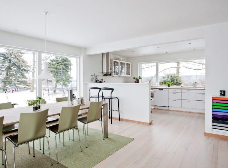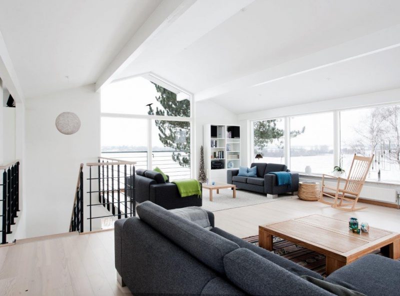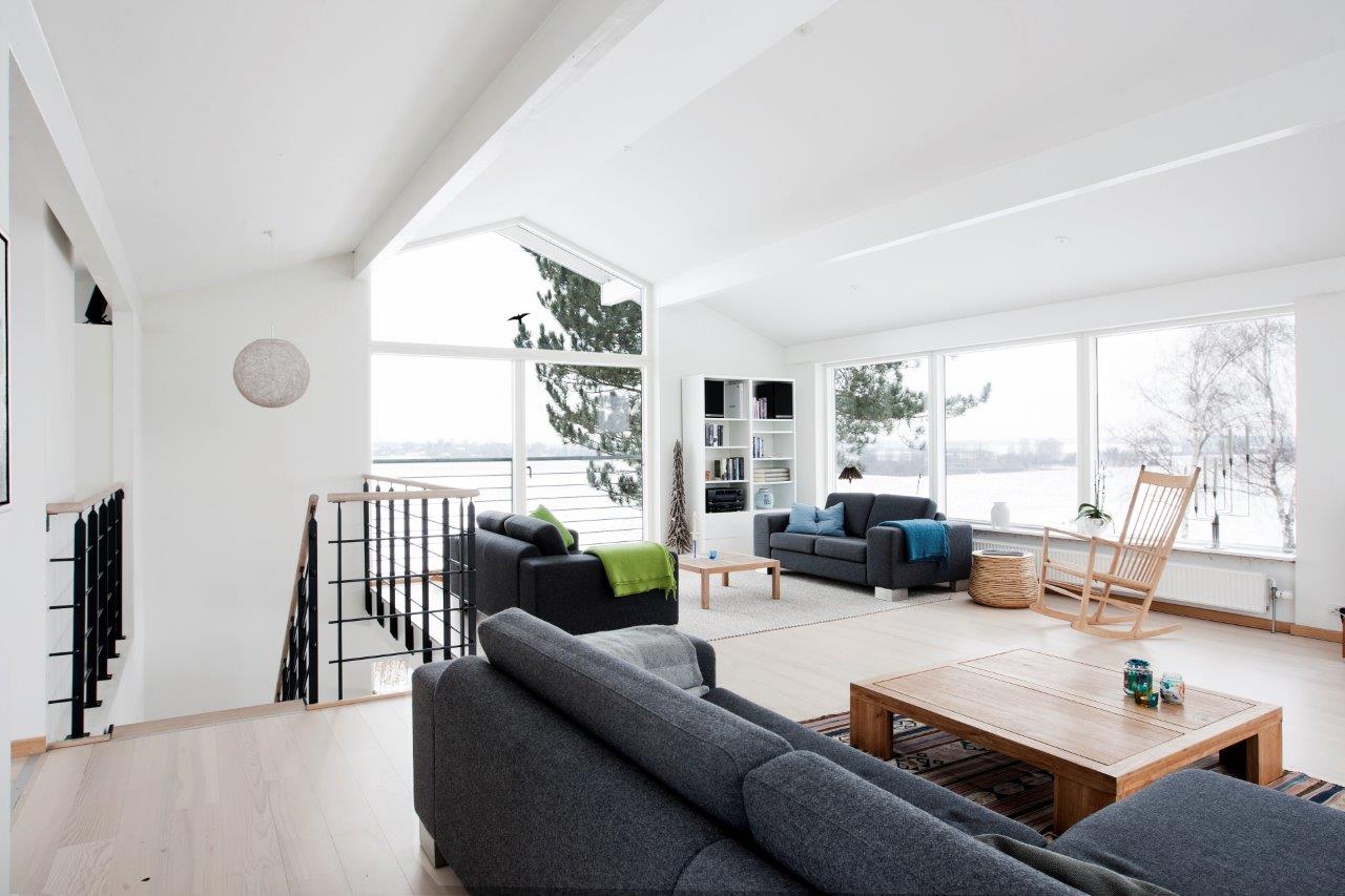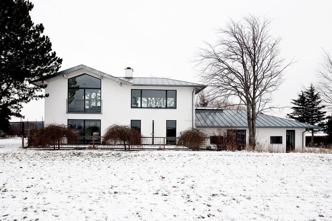 Om- og tilbygningen er udført efter gældende BR-krav. Taget med Plannja Pandeplader er efterisoleret, mens døre og vinduespartier fra VELFAC opfylder tidens bedste energikrav. Brændeovnsindsatser er fra Meteor-Jupiter. Trappen er smedet af Smede Design.