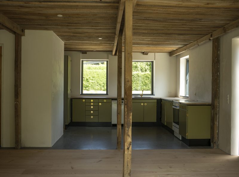 Den tidligere staldbygning er efterisoleret med gasbeton i ydermure og alle nye indre vægge er ligeledes opbygget i gasbeton. Byggeprojektet er udført som hovedentreprise med lokale håndværkere, og mange beslutninger om både konstruktion og overflader er taget på stedet i dialog mellem arkitekt, ingeniør og håndværker. Inde har arkitektparret selv blandet og malet med kridt-caseinmaling, der ud over at sikre husets åndbarhed, også reflekterer lyset på bedste vis.