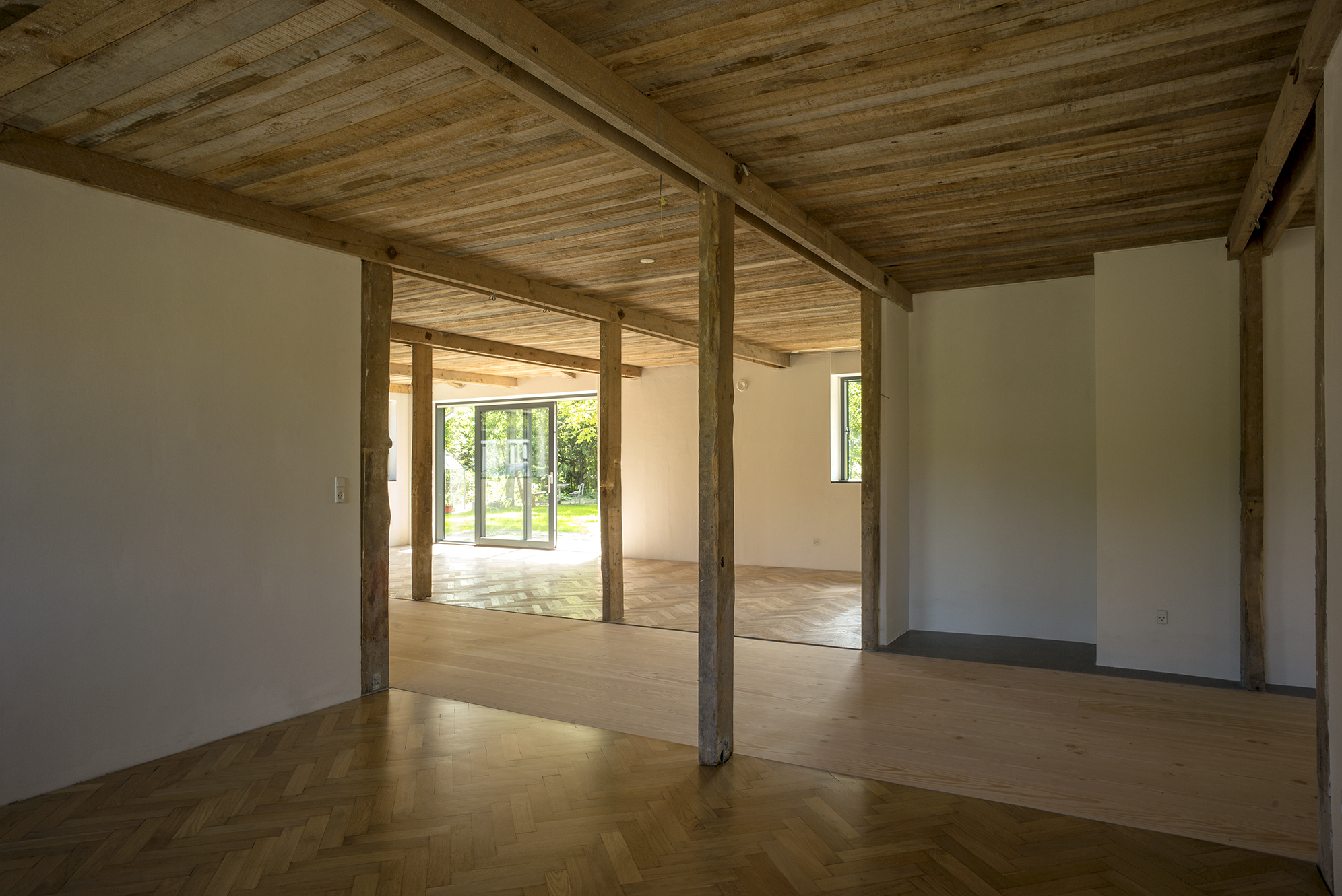 Den gamle 170 m2 store bygning, som tidligere var ejet af arkitektens morfar, blev oprindelig udnyttet til stald. Denne funktion præger bygningens overordnede disponering med en bred midtergang og en bærende konstruktion af søjler, der på hver side af midtergangen danner fleksible rum med stor anvendelighed. Fastholdelsen af fleksibiliteten udnyttes i den nye bolig til at skabe oplevelsesrige, pirrende rumlige overgange og sammenhænge.