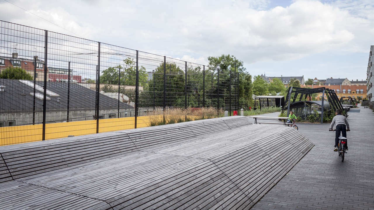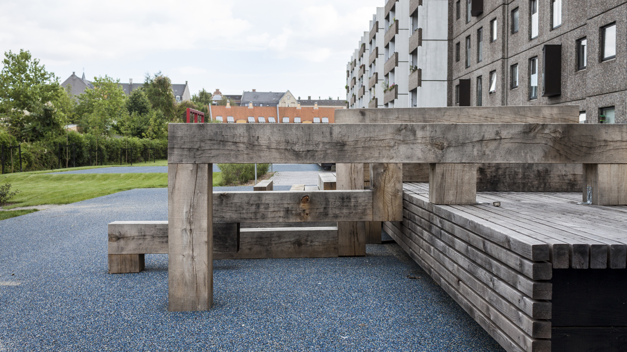 Gårdrummet, som før var en lang kile og mest brugt til gennemkørsel, er nu inddelt i zoner på tværs af kilen, som nemmere kan bruges af beboerne i større eller mindre grupper.