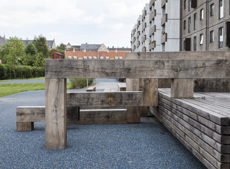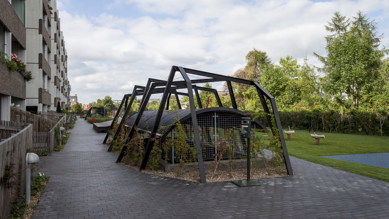 Gårdrummet og arealet foran blokken er udviklet i tæt dialog med beboerne på workshops og med et midlertidigt arrangement i gården. I samråd med beboerne blev det besluttet at lukke gårdrummet, øst for boligblokken, da det tidligere været brugt som et gennemgangsområde til stor gene for beboerne. Med gårdrenoveringen skabes plads til både stille og livlige aktiviteter.