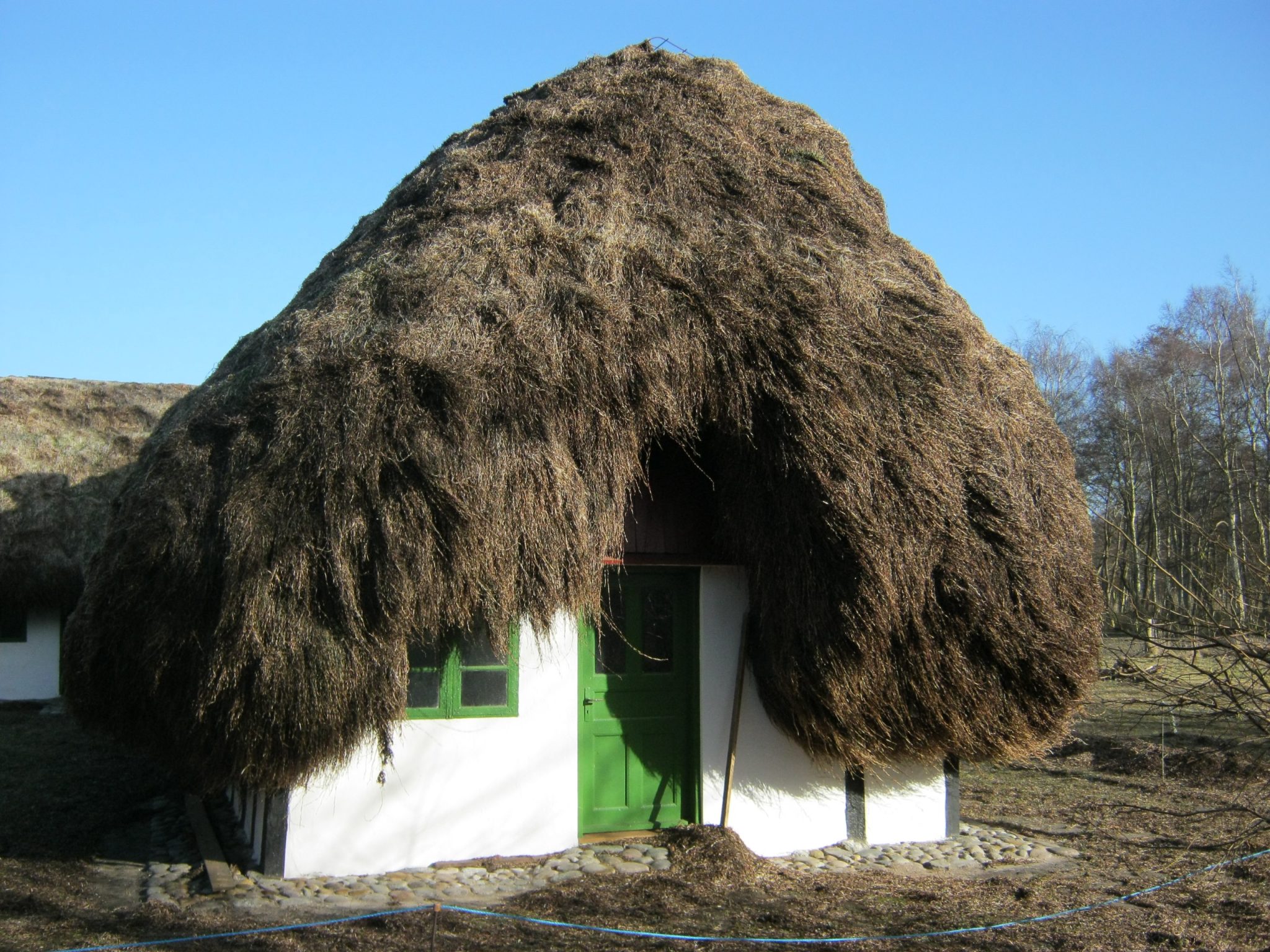 Vaskerne er snoet omkring tagets 3 nederste lægter. Resten af taget består af tonsvis af løst tang, der trædes godt og grundigt ned undervejs. Til dette hus blev der brugt knapt 49 tons tang.