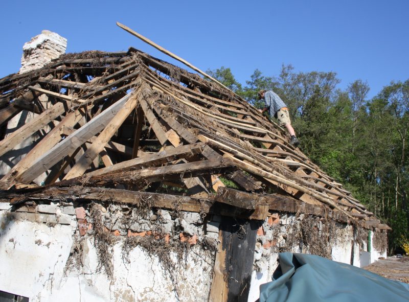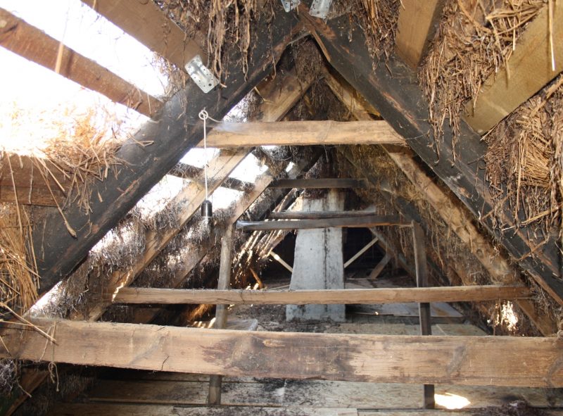 Den ene af huset to skorstenspiber eksisterede stadig ved starten, men i en meget dårlig stand. Den anden var nedrevet til midt i tagrummet. Der blev opmuret to nye skorstenspiber over resterne af de oprindelige ildsteder. Taget blev lægtet med ”finske lægter”. Det vil sige graner, som er afbarket og savskåret på to sider. Store dele af taget og lægterne er synlige indefra. Da der andre steder har vist sig problemer med utætheder nederst de første par år, blev lagt en bane undertag nederst ved tagfoden. Undertaget forudsættes fjernet efter et par år.