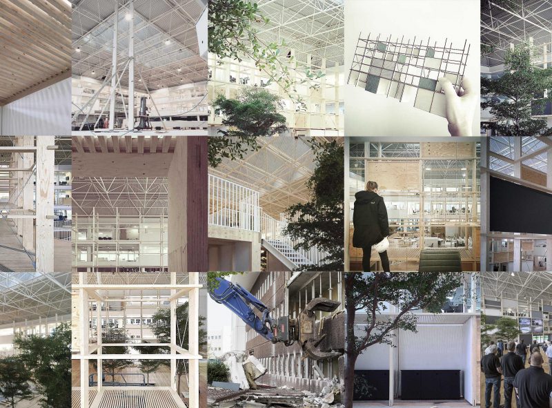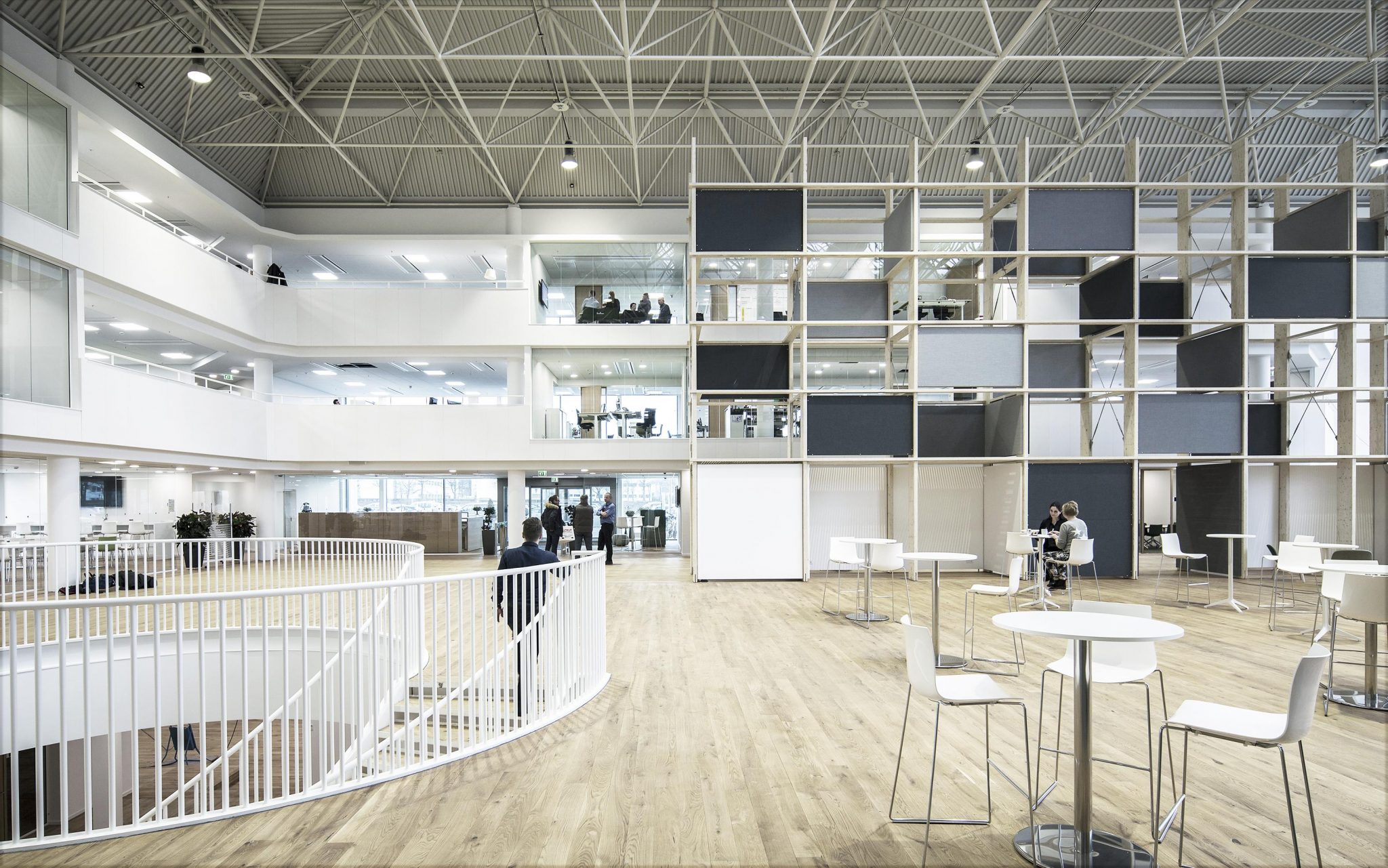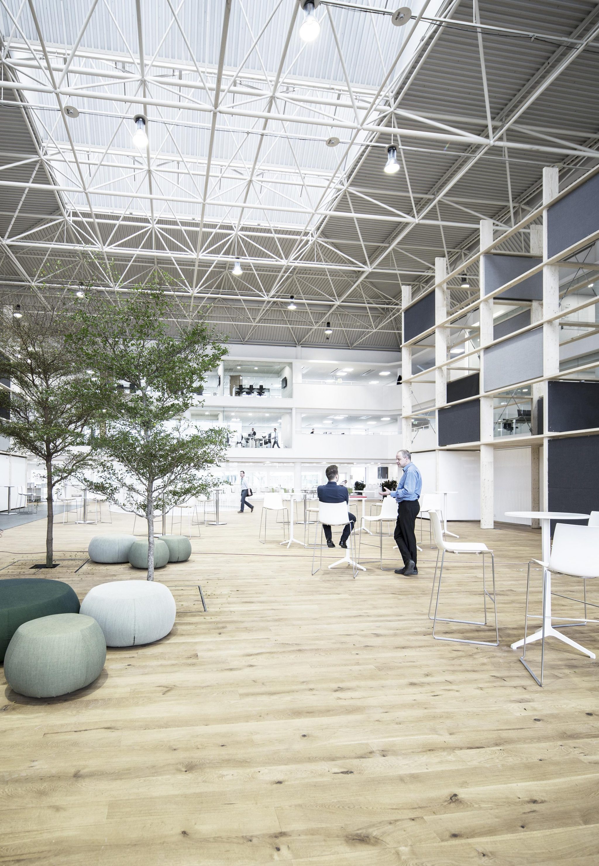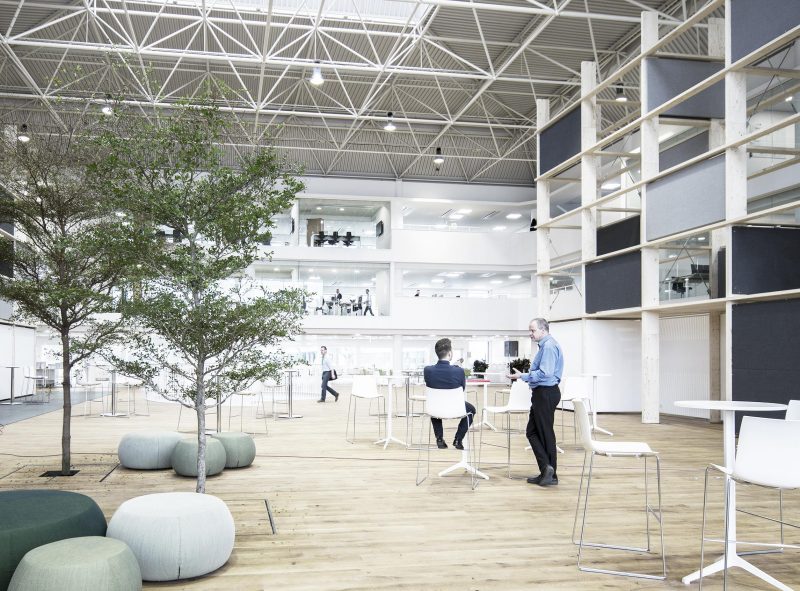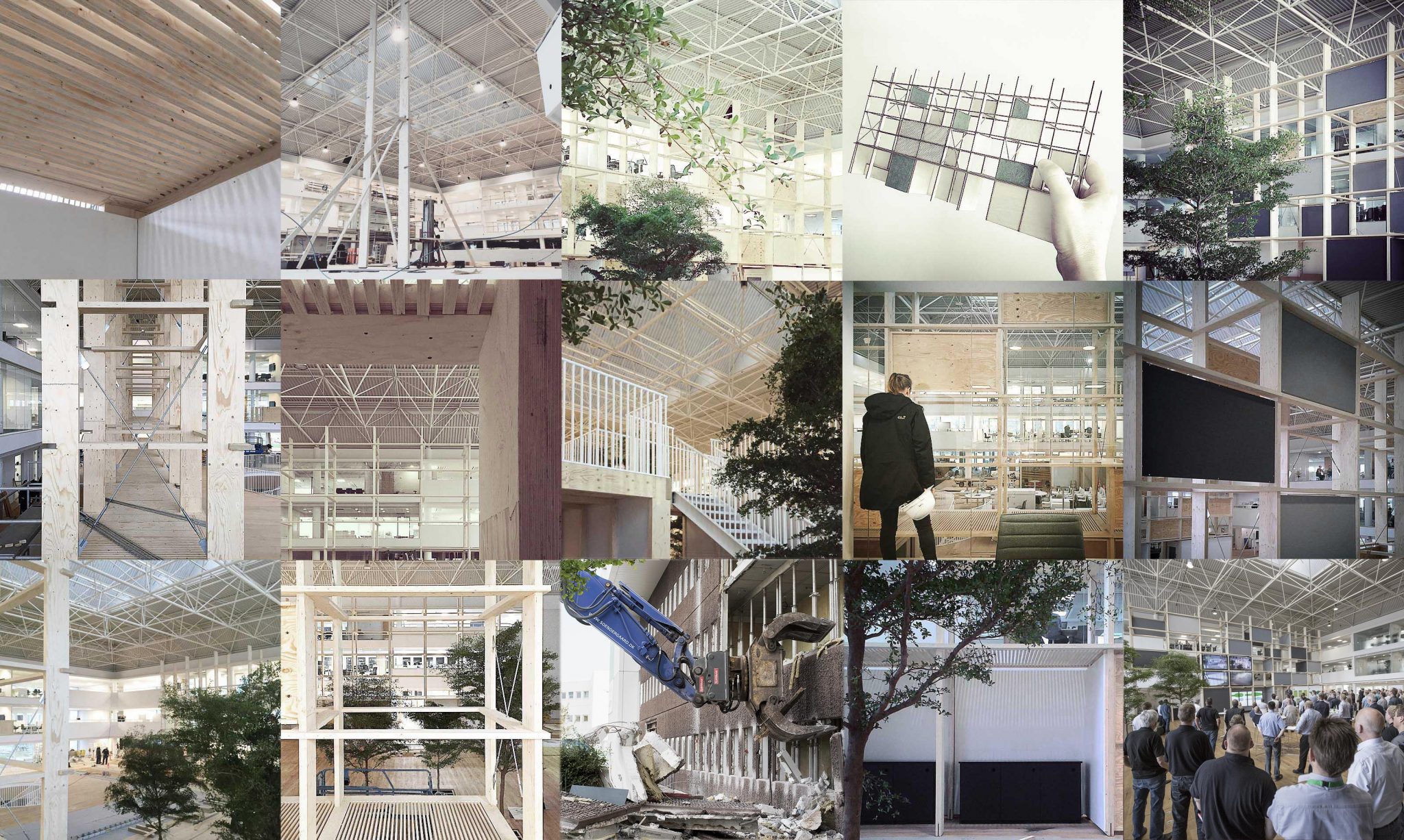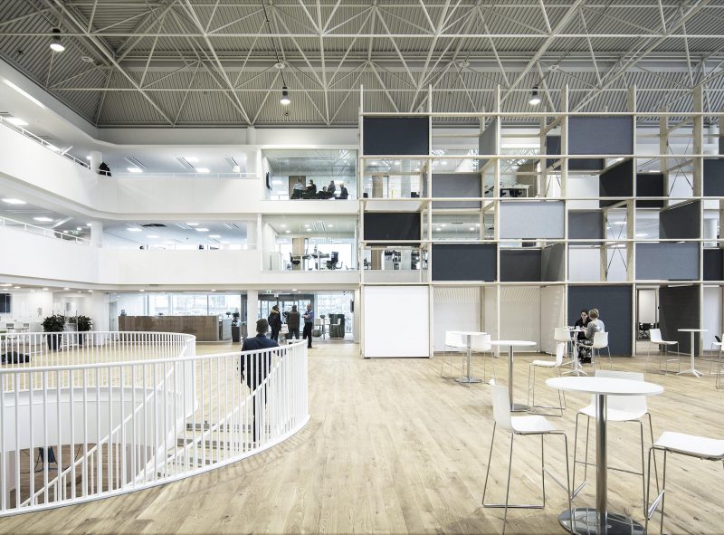 Fra ombygningen heraf vil vi gerne fremhæve det store atrium der i mange år blev anvendt til serverrum og herefter byggevarer-udstilling. En betonmur er fjernet så et blødt dagslys sammen med ovenlys tegner rummet. Bygherren anede uråd om anvendelsen af det store rum i midten. Svaret var to rumstore “reoler” der iscenesætter rummet med præcise let adskilte zoner til læring, udstilling, møde og større events. I mellem dem er plantet træer forsænket ned i det eksisterende installationsgulv. De 9 meter høje reoler er udført i industrialiseret kertotræ. Et materiale mest brugt til opbygning af skjulte konstruktioner, men her eksponeret som et haptisk element i det nye Nordiske hovedsæde til den internationale koncern Schneider Electric. Ophængte skærme til projektion og akustisk dæmpende skiver tillader at mange forskellige aktiviteter kan foregå samtiddigt. Bygningsejer, udlejer og rådgivere har i et frugtbart samarbejde forfulgt ideen om at skabe en energieffektiv og dynamisk kontorbygning med optimale rammer for virksomhedens medarbejderne og kunder.