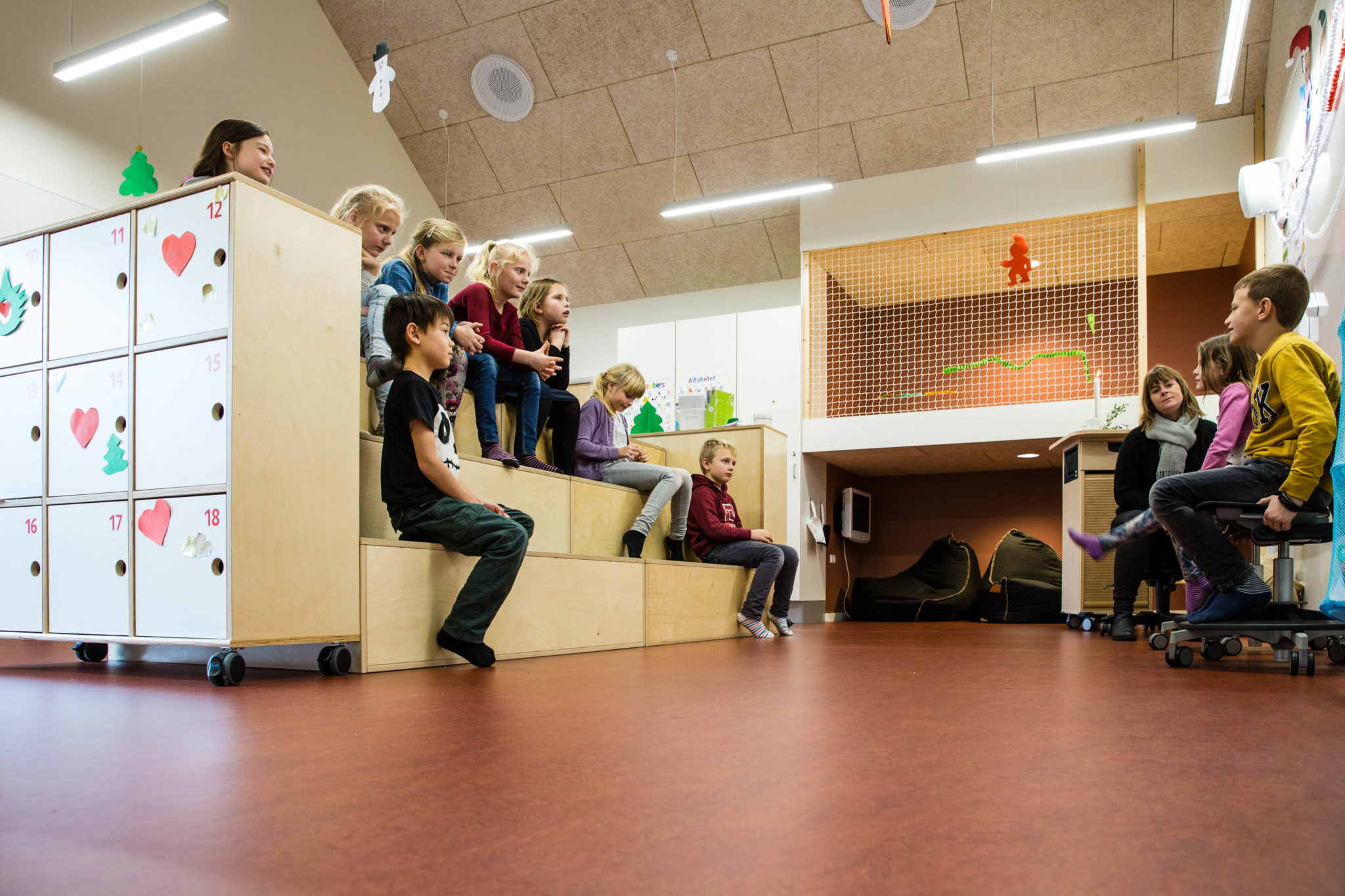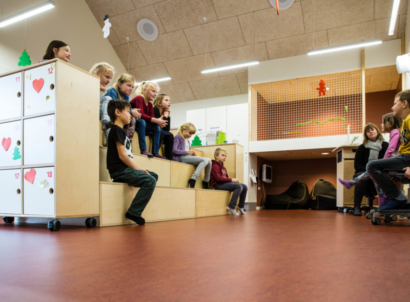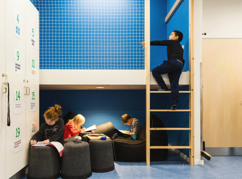 Undervisningsbaser er designet så de har bygningsintegreret hule, hems og siddetrapper i vinduesnicher samt udgang til det fri og transparens til fællesarealer. Det valgte inventar supplerer med siddetrapper / bjerge, lette skriveplader, bløde møbler og hynder samt enkelte borde og stole i forskellige højder således at der er plads og rummelighed til at lære aktivt og varieret. Og der er masser gulvplads og god mulighed for at bevæge sig.