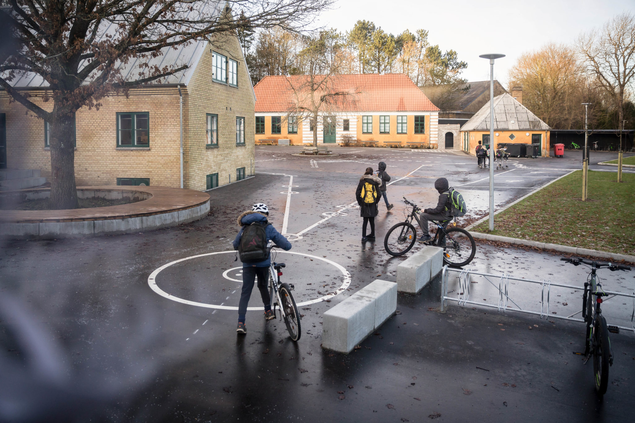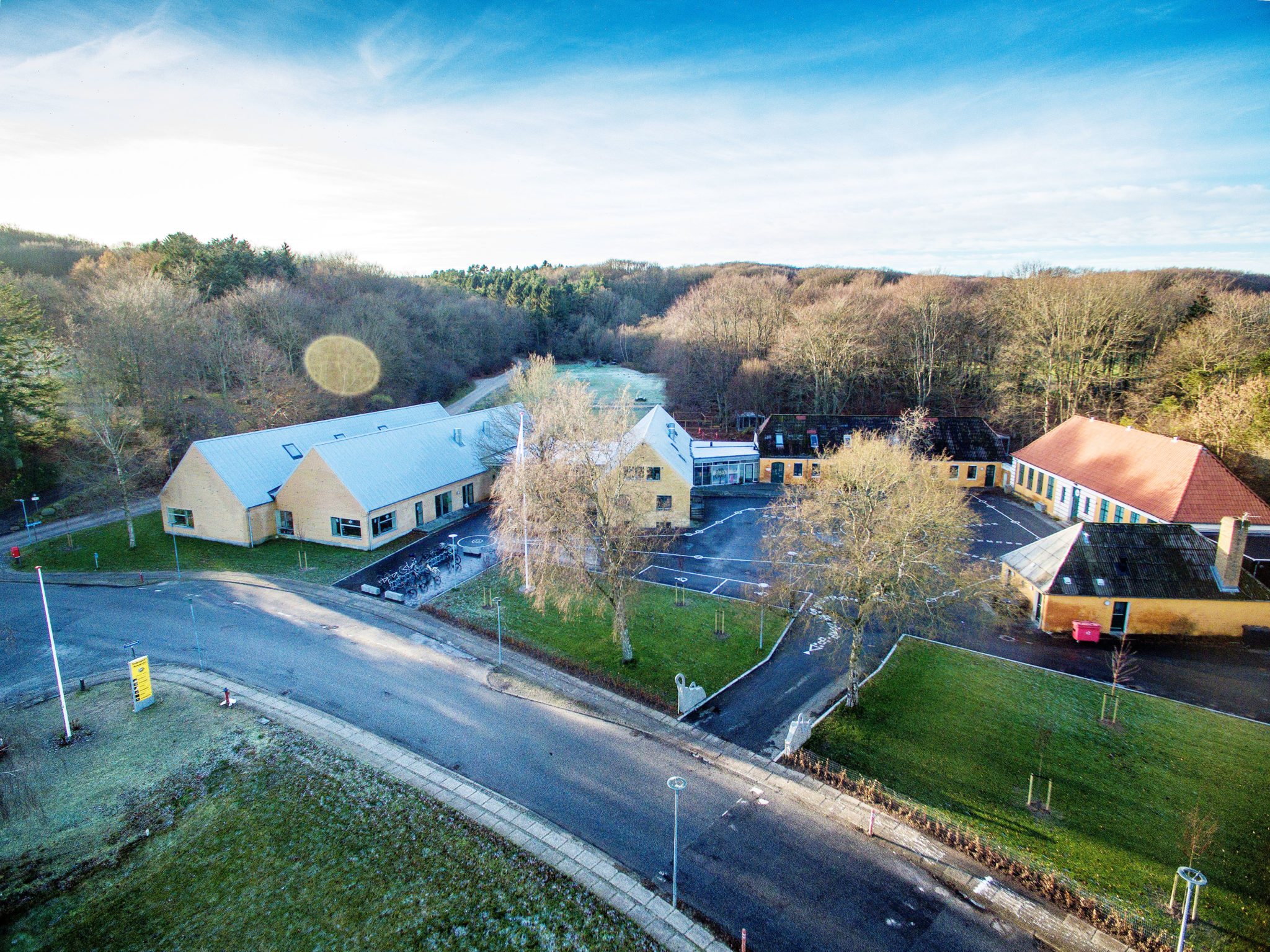 Den transparente garderobebygning danner overgangen mellem det nye og det gamle, mellem by og skov, og herfra kan man nu gå tørskoet fra indskolingen til biblioteket, personaleforberedelse og administration. Den nye og mere urbant intime gård, lille gård, danner rammen om mellemtrin elevernes adgang til og fra skolen. Samtidig er det et godt sted at hænge ud, idet der er opholdssteder på kanten og i centrum under det gamle egetræ.
