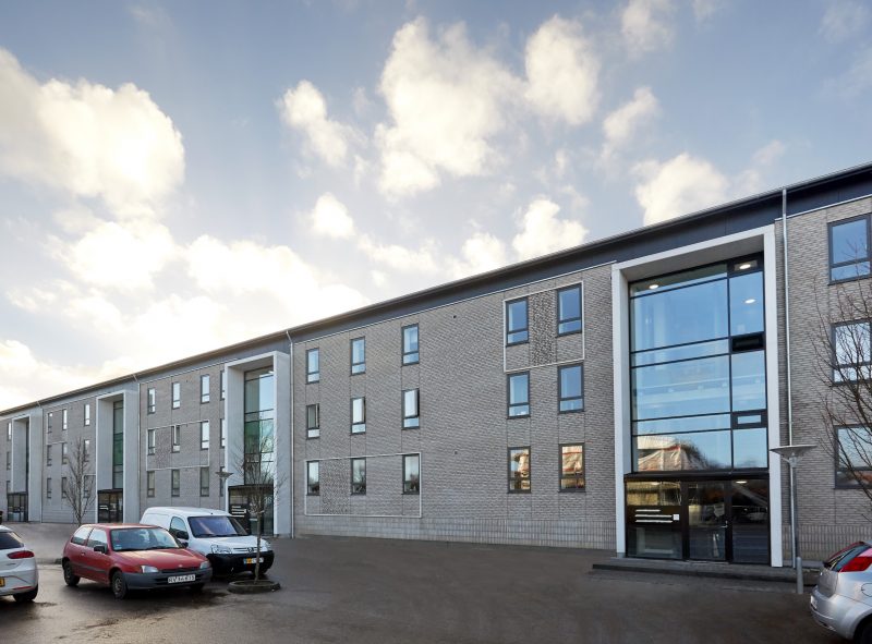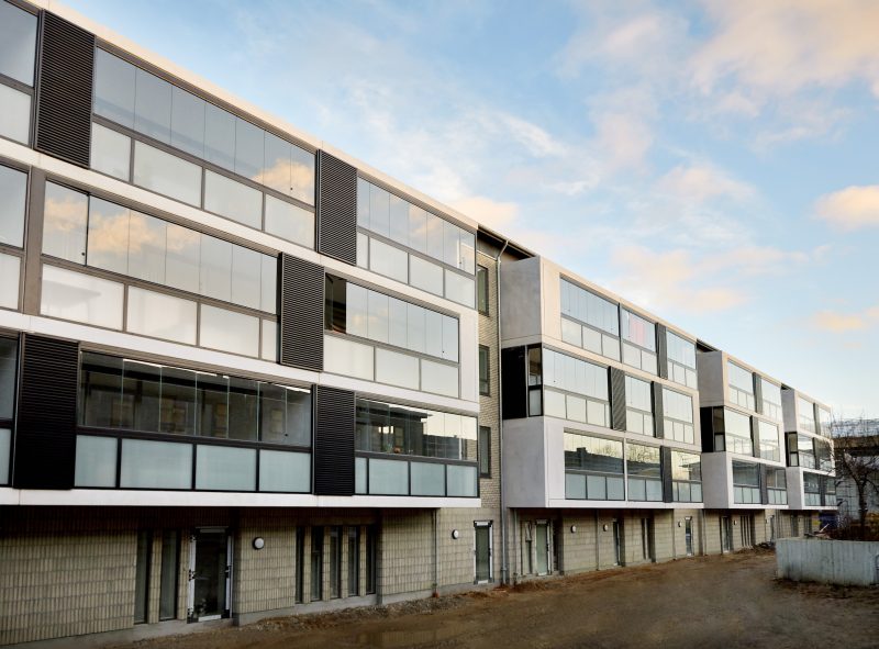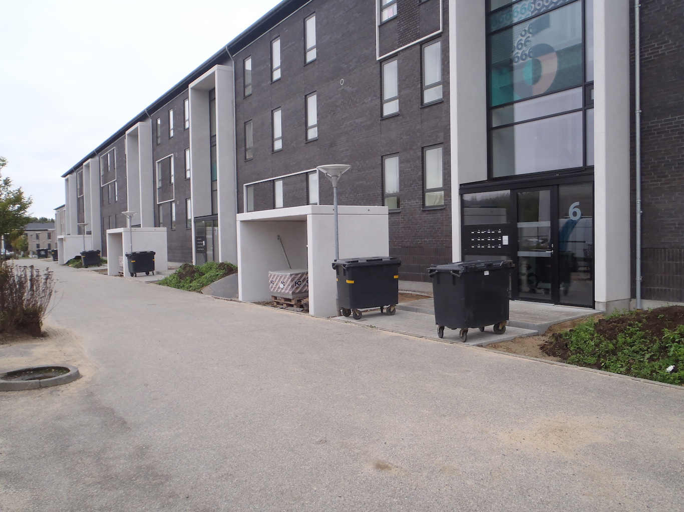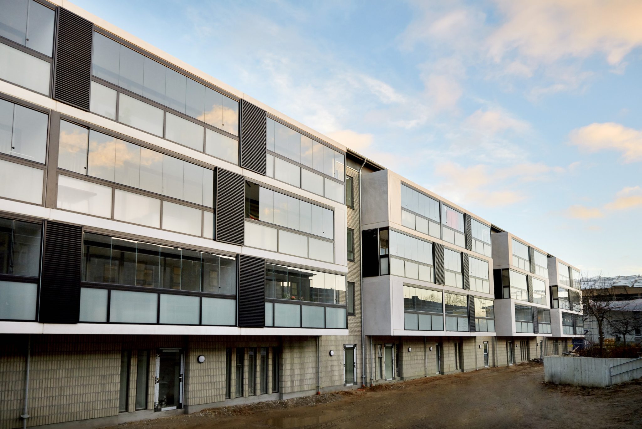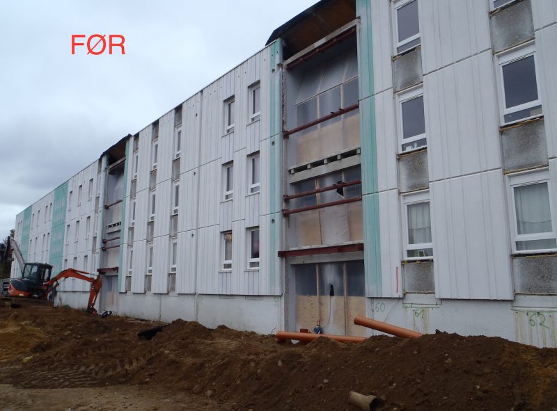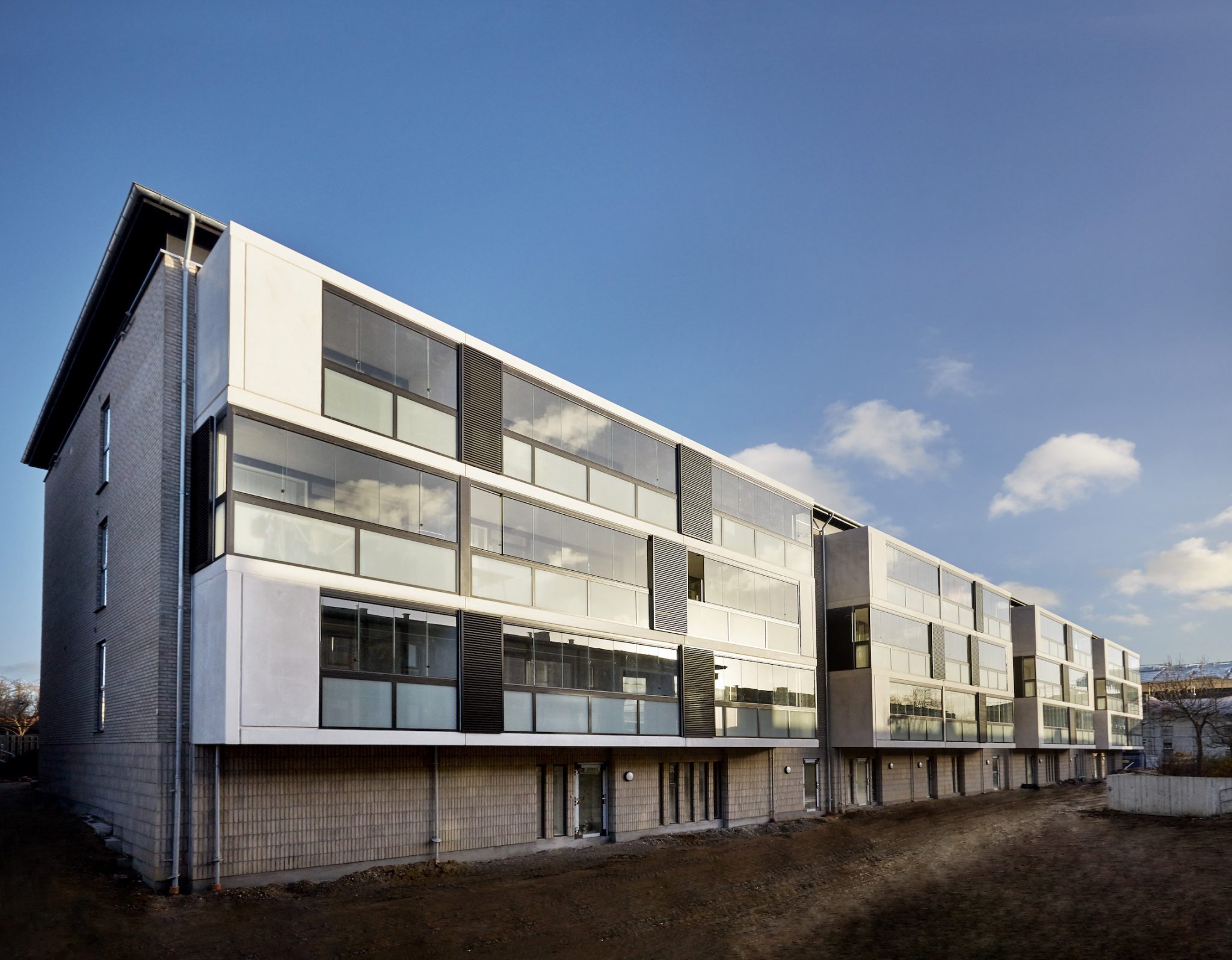 Efter renoveringen en robust bebyggelse i et arkitektonisk udtryk præget af gedigne materialer og et elegant udtryk i lysegrå tegl, hvid fiberbeton, sorte skifferbestrøede og listedækkede paptage. Holdbare løsninger med et minimum af vedligehold.
