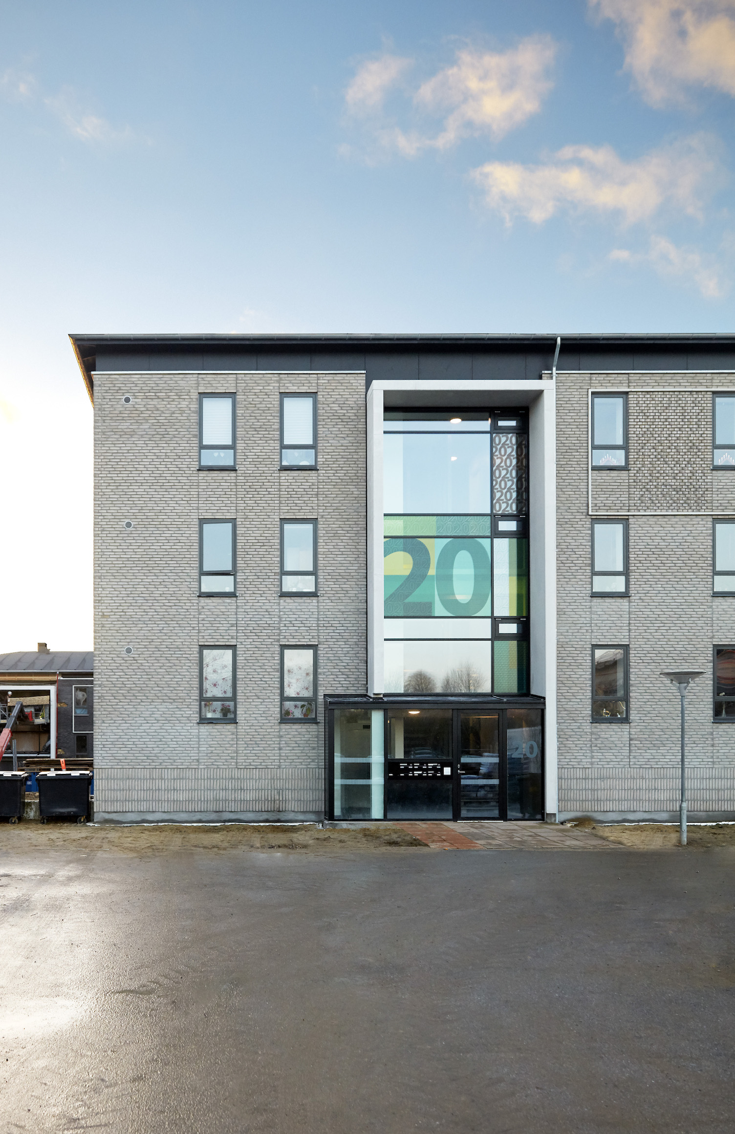 De lange opgange i 2-4 etagers højde får store glaspartier i facaden, så dagslyset oplyser rummene. Glaspartierne i facaden er grafisk- og farvemæssig bearbejdet i samarbejde med en grafiker. Opgangene vil fremstå som lysende kiler mod indgangsfacaden.