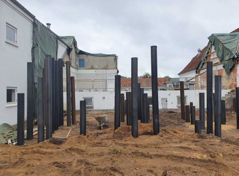 Hvad man ikke kan se på denne 3D-tegning, er rørføringen og kloakeringen, der går under den nye bygning, og som har været lidt af et puslespil at få til at gå op på grund af piloteringen. 3D-tegninger bidrager derudover til at fremhæve de virkelige forhold, så både entreprenør og bygherre nemt kan visualisere, hvordan resultatet kommer til at se at ud.