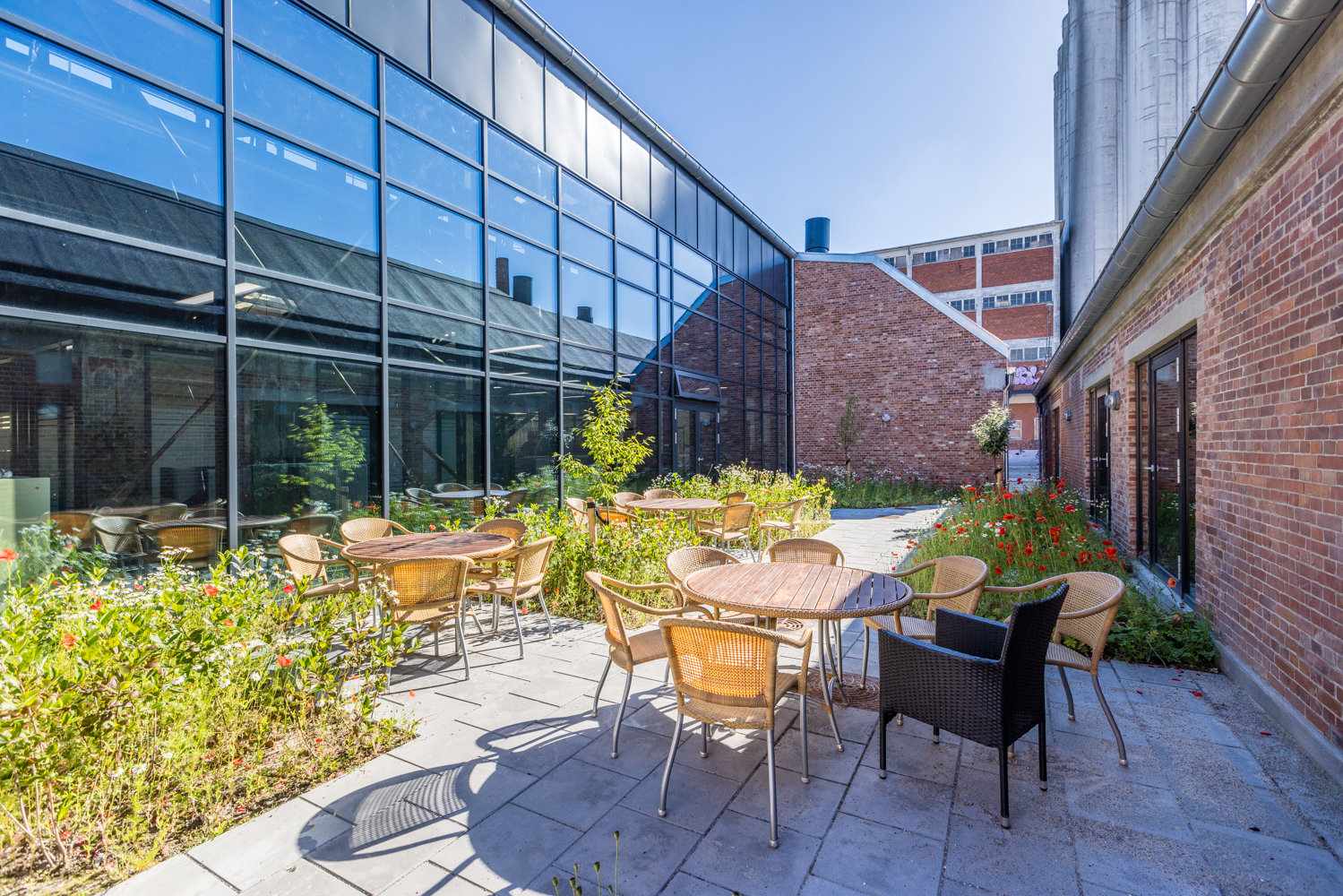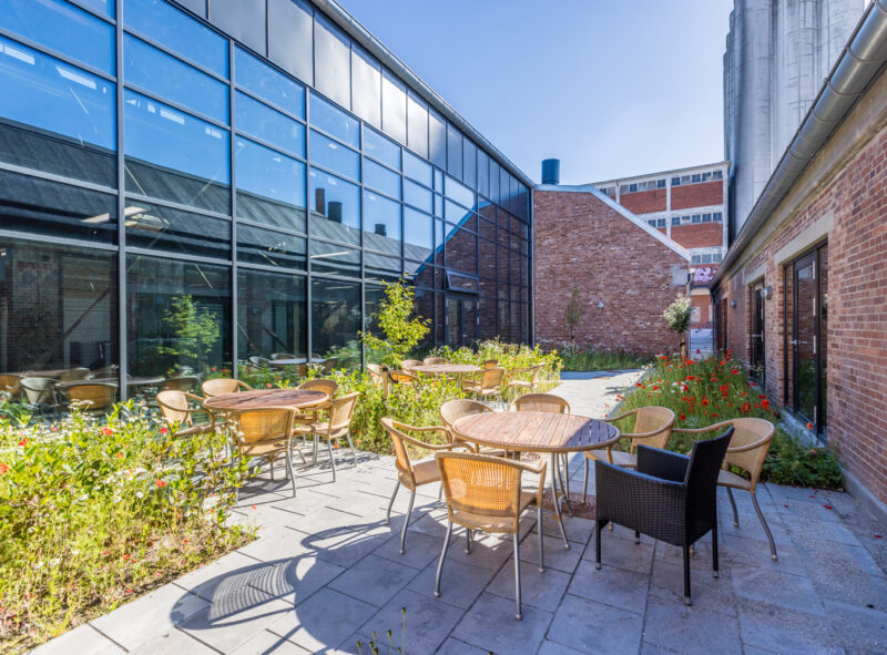 For at sikre et optimalt arbejdsmiljø er der implementeret væsentlige forbedringer i den historiske bygning, herunder isolering af tagkonstruktionen, terrændæk med gulvvarme og optimering af dagslysforhold. I samarbejde med vores arkitekt er der skabt et udendørs opholdsrum mellem de to lejemål, som ikke blot tilfører lys til bygningens midterkerne, men også skaber et hyggeligt gårdmiljø med grøn beplantning og siddepladser, som ellers ikke findes naturligt på Odense Havn.