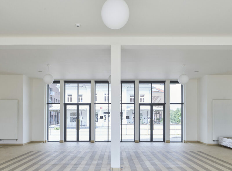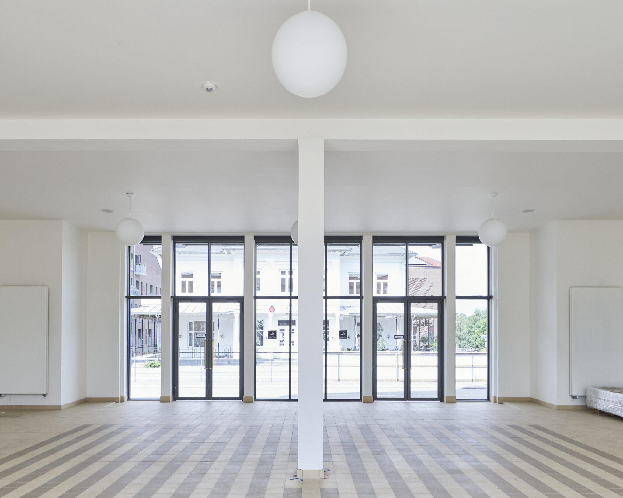 Forhallen fremstår igen som et lyst og imødekommende rum, med materialer i en kvalitet tilsvarende de oprindelige overflader i bygningen.