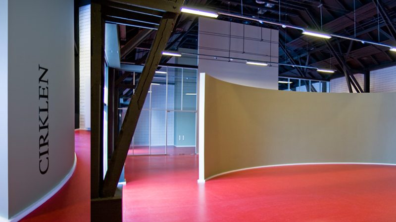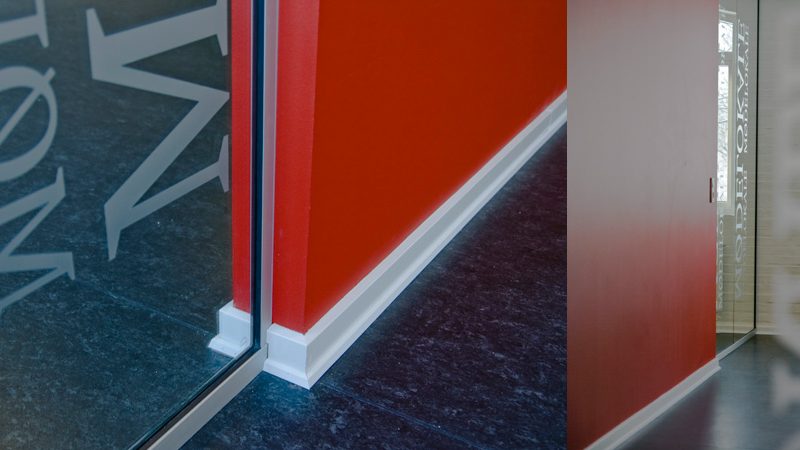 Skiltning indgår som et grafisk element med tryk på glas og store tekster monteret på vægflader.