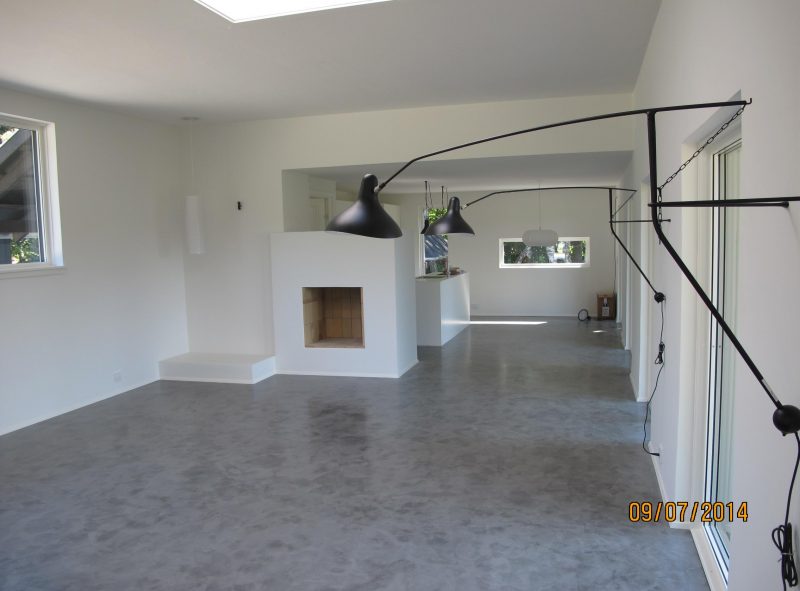 Det oprindelige atelierrum er blevet udvidet i hele husets længde. Sammen mad ovenlys og vinduesreguleringer er der skabt et nyt arkitektonisk spændende inspirerende rum.