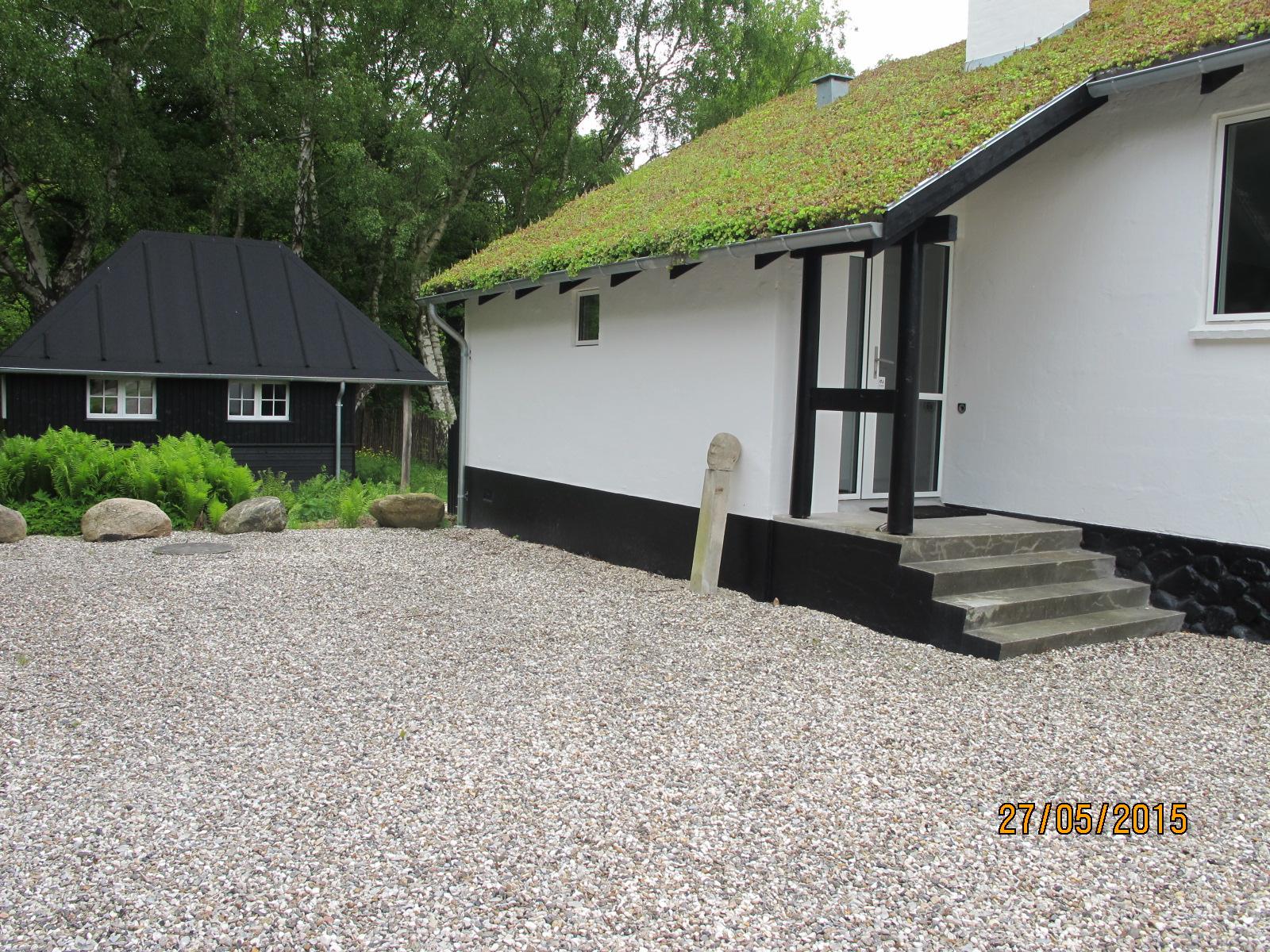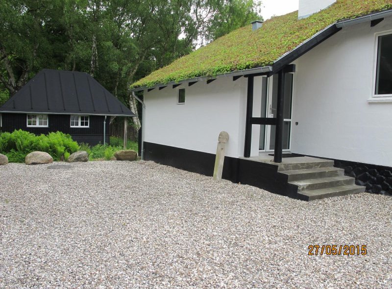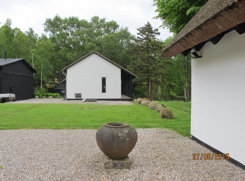 Den nuværende ejer bad os tegne et projekt, hvor huset skulle indrettes til gæstehus og atelier for tøjdesign. Herudover skulle det lille stråtækte hus indrettes til saunahus med adgang udendørs fra atelierhusets badeværelse.