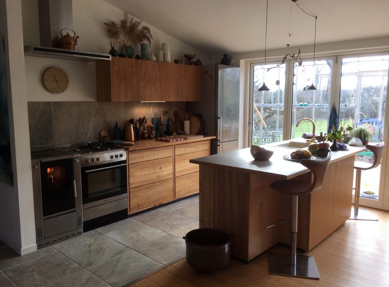 Brændekomfuret er et kapitel for sig, relativ ukendt i Danmark, vi faldt for en rustfri udgave fra Wamsler i Tyskland. Det pynter meget i køkkenet og virker helt fantastisk. Det er med glaskeramisk kogeplade og bruges i vinterhalvåret til madlavning, giver en hyggelig varme i køkkenalrummet.