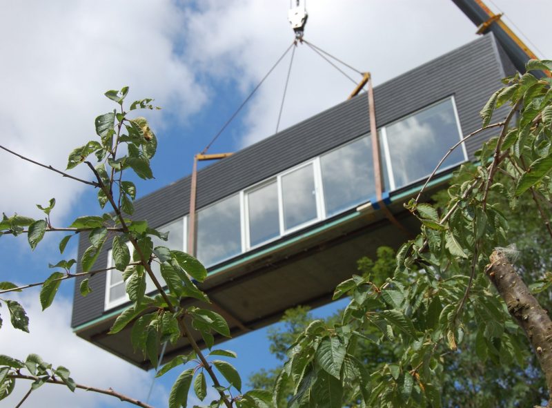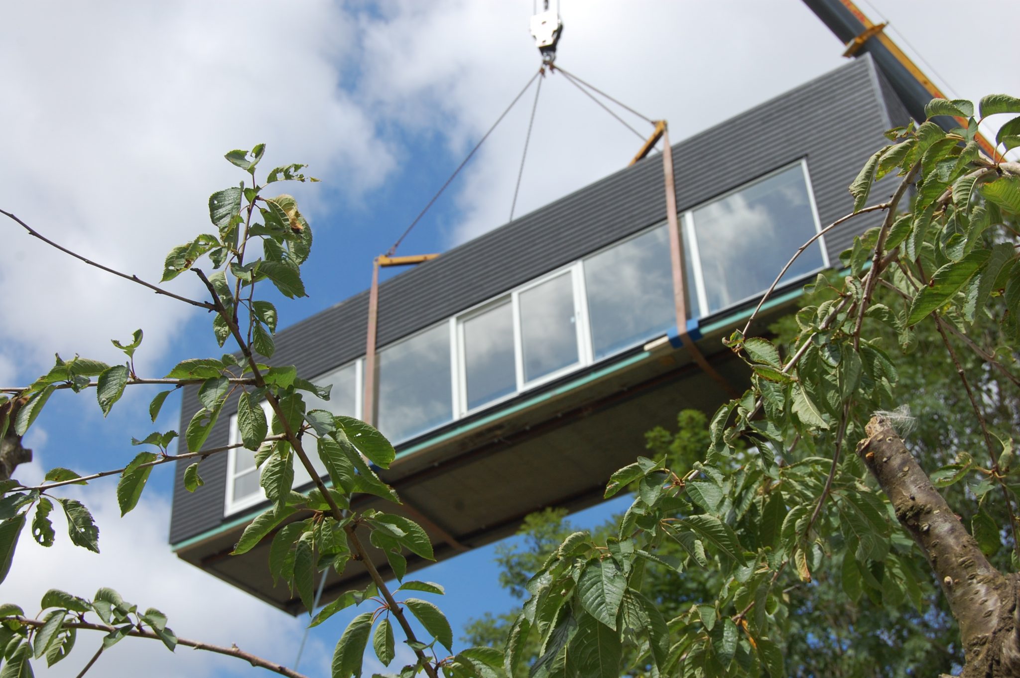 I august 2018 kom modulerne med en stor mobilkran. Beboerne i Sorring havde med stor undren fulgt mit arbejde samt entreprenørens kloak- og fundamentsarbejde, og de var mødt talrigt op, da kranen løftede vores hus 20 m op i luften og satte det ned i haven. Om aftenen havde vi et hus i haven.