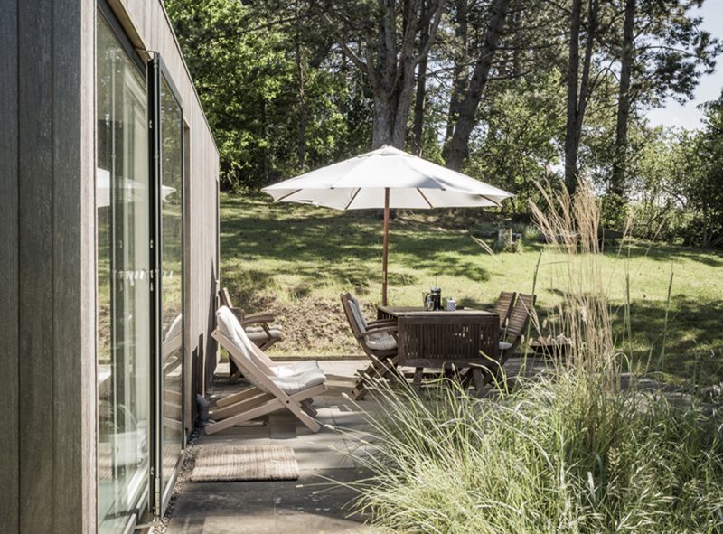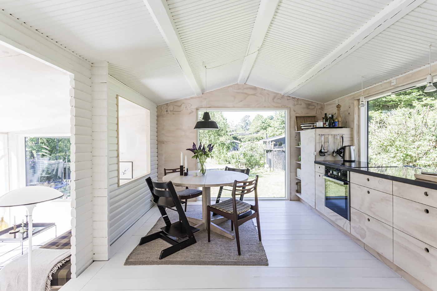Udsyn og dagslys er vigtige parametre når man er en familie på 4 på 60m2. Således binder sommerhuset verdenshjørnerne sammen via vindue og dørsætningen og de gode kig til den grønne naturgrund på tværs i alle retninger giver konstant fornemmelsen af at det er et levende spil mellem inde og ude. Udsigten til haven foregår på flere niveauer og det giver en variation henover dagen og årstiden og har en positiv indvirken på krop og sjæl.