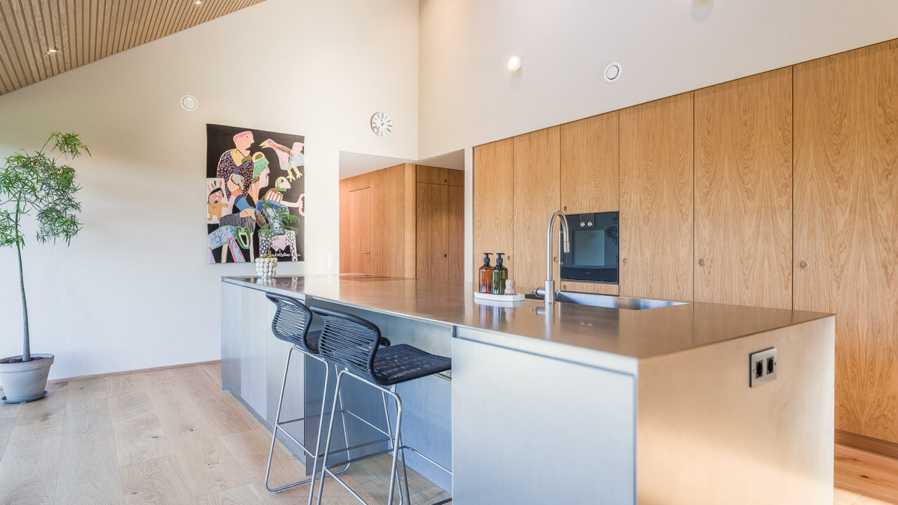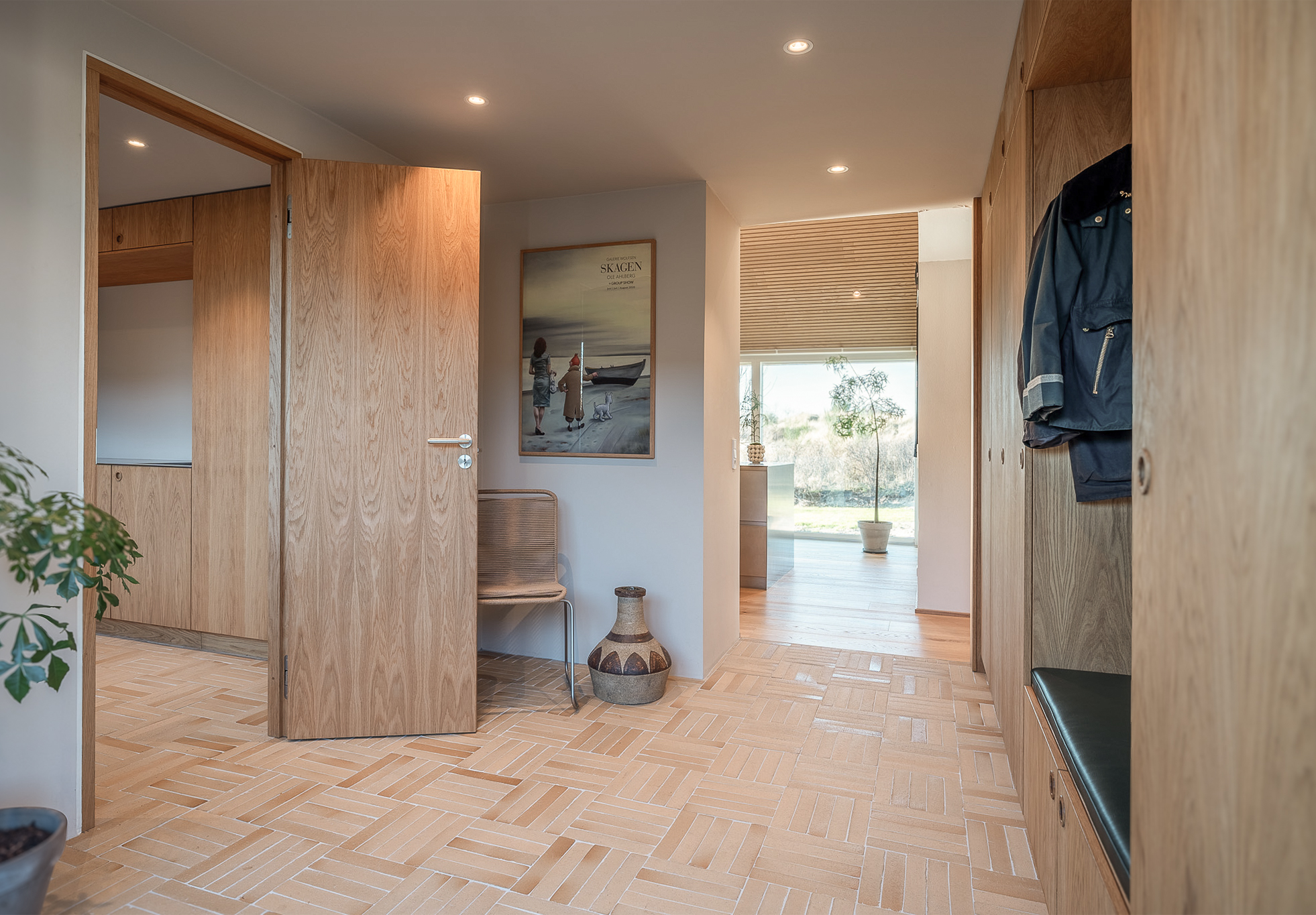 Planløsningen blev gentænkt for at udnytte det eksisterende fodaftryk optimalt og skabe et nyt og dynamisk flow i bygningen. Entréens placering blev omhyggeligt redesignet, så den nu åbner sig direkte mod den omgivende natur og heden, hvilket fremhæver boligens unikke kontekst. Efter at have passeret entréen træder man ind i husets centrale zone, hvor arkitekturen skaber en visuel forbindelse til alle verdenshjørner. Denne åbne planløsning forbinder hjemmets forskellige områder og giver en oplevelse af sammenhæng og nærvær, samtidig med at den understreger husets relation til den omgivende natur.