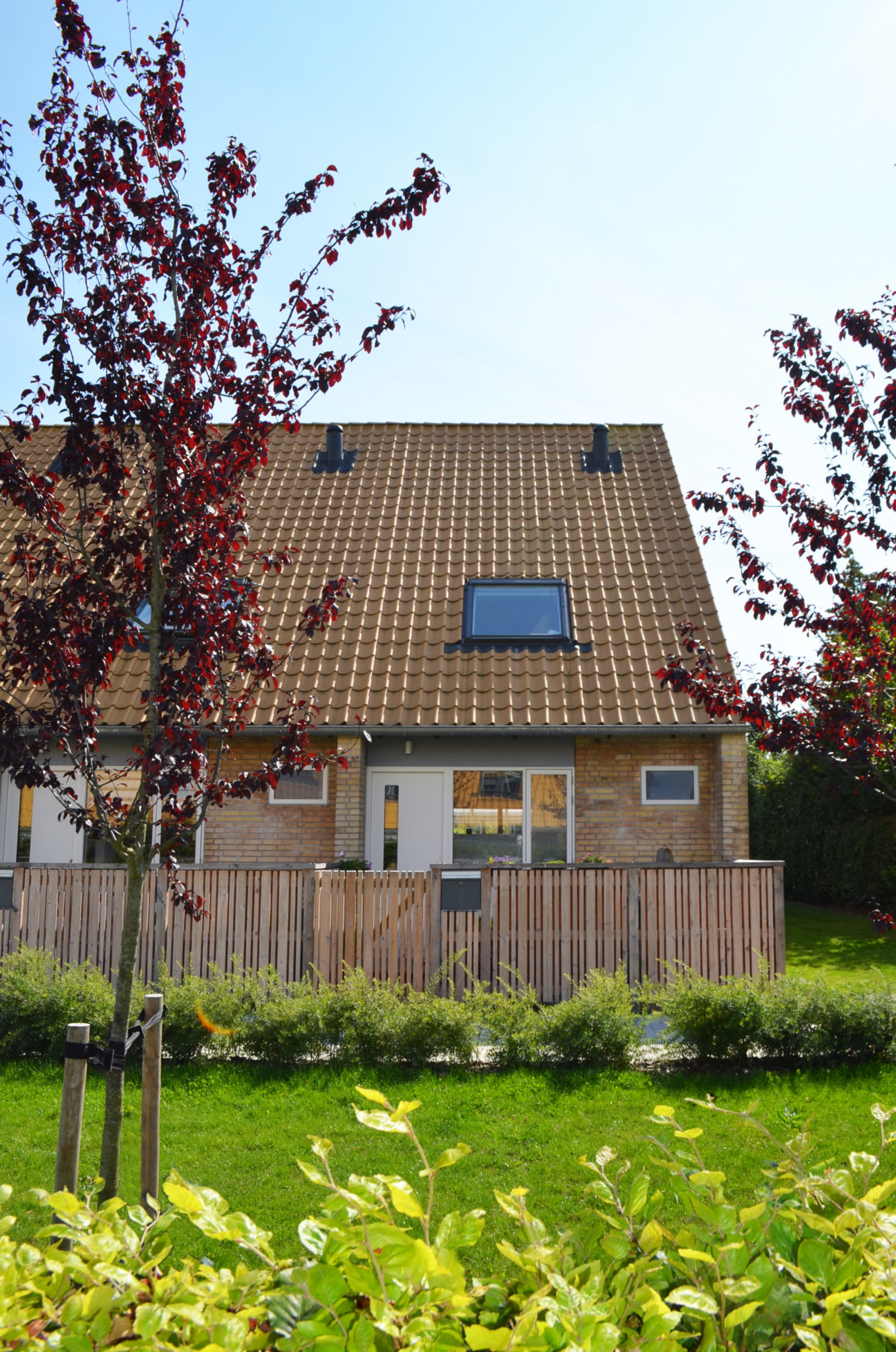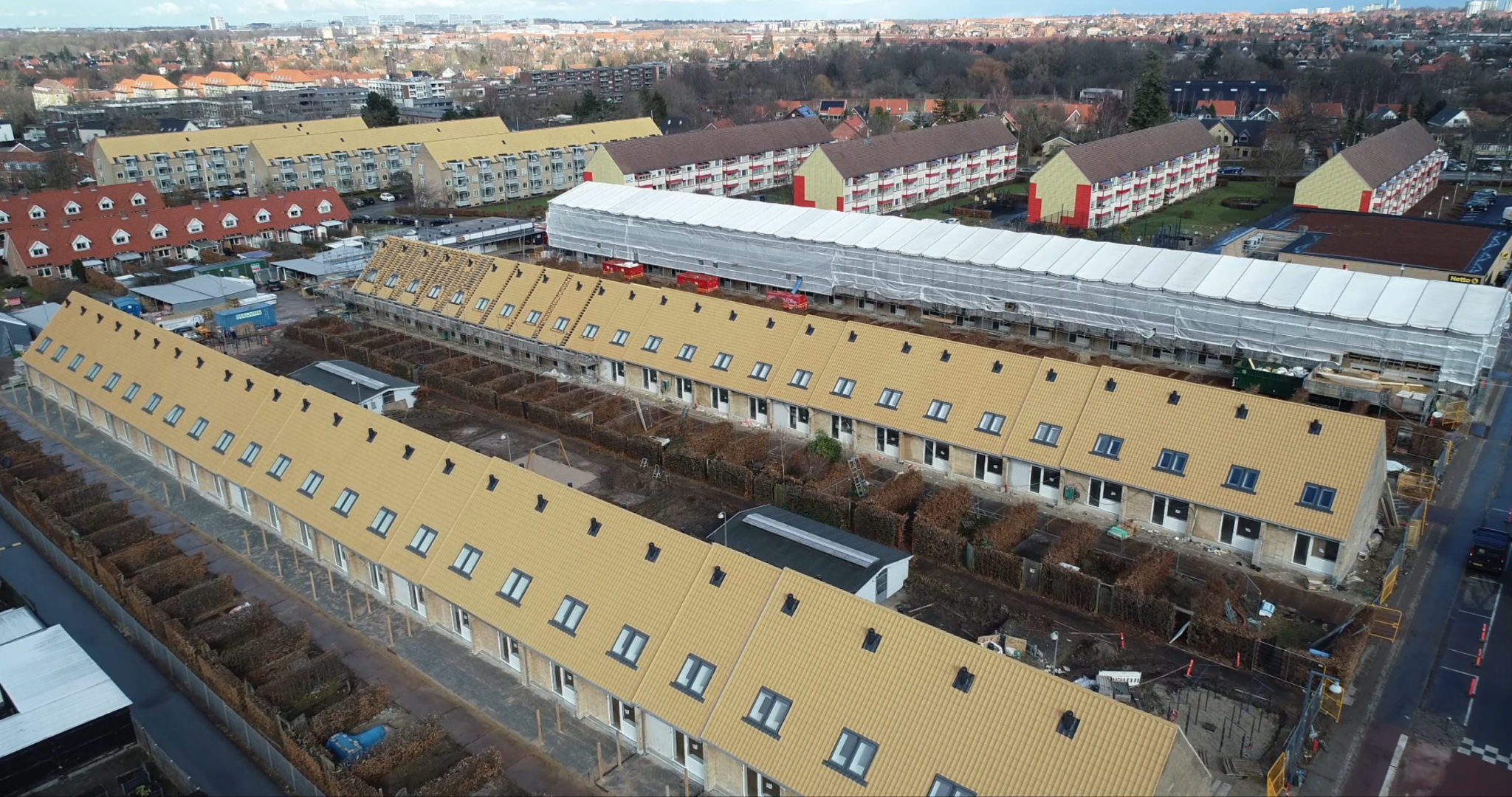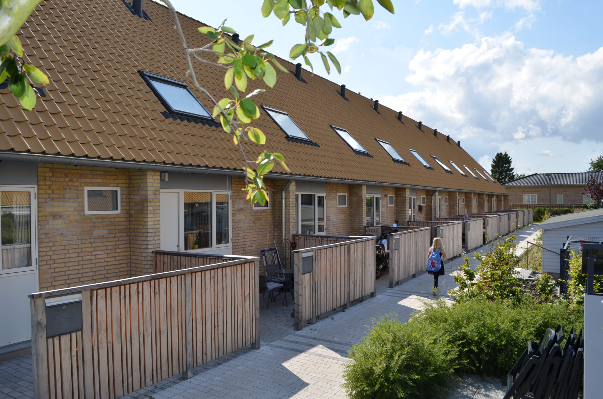 Taget på rækkehusene er blevet efterisoleret til nutidig standard, og tagbelægningen er udskiftet til gule teglsten svarende til det oprindelige udtryk.