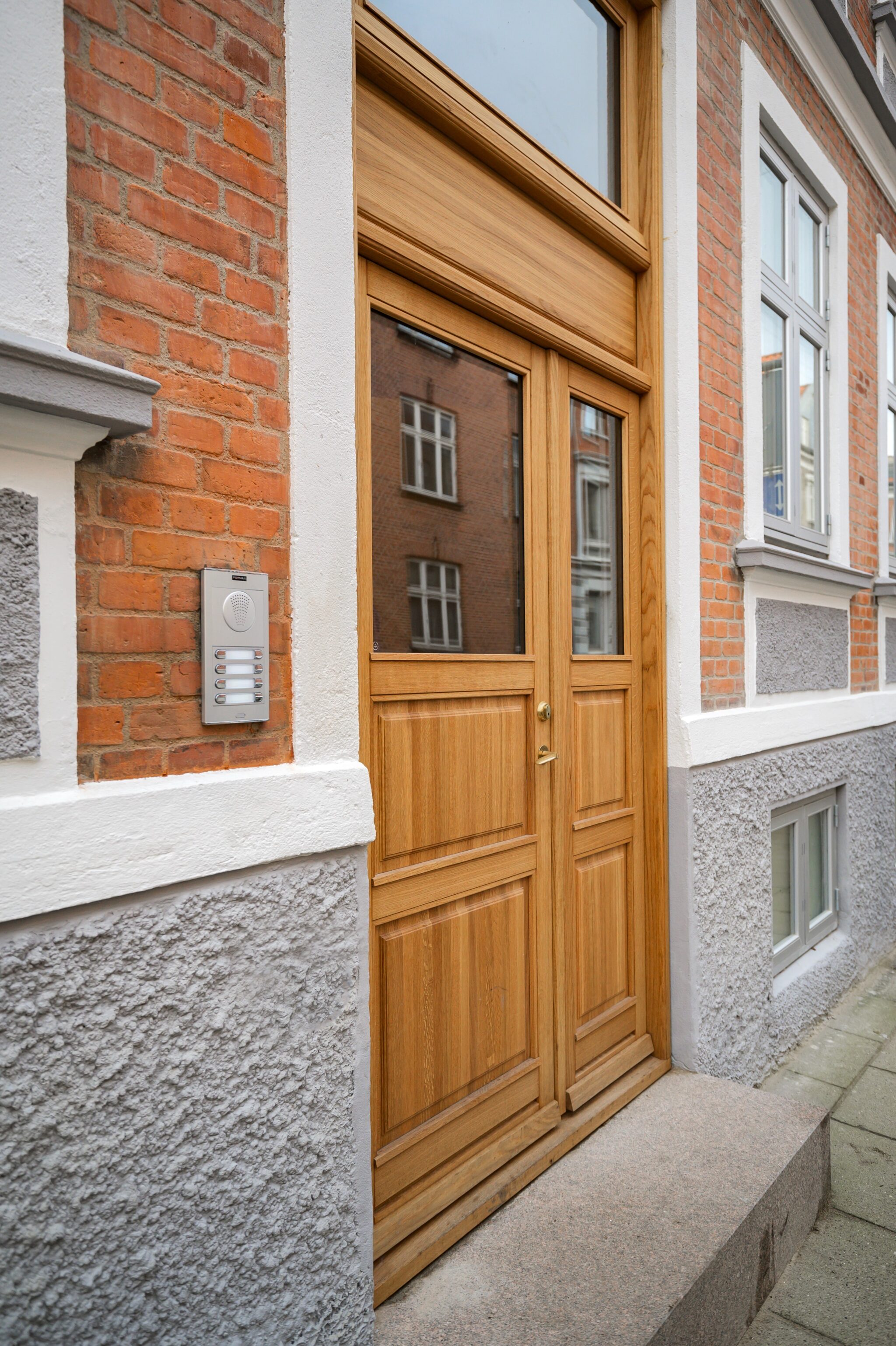 Ejendommens facader er alle blevet afrenset og fremstår nu i blankt murværk. Gesimsbåndet og andre detaljer i facaden er blevet renoveret efter de håndværksmæssige traditioner, så de i dag fremstår fuldendte. Vinduerne er udskiftet til nye dannebrogsvinduer og ejendommen er tilført 4 nye rytterkviste beklædt i zink. Hoveddøren er blevet udskiftet med en ny flot egetræsdør, som passer perfekt ind i helheden og dermed fuldender udtrykket af en klassisk byejendom i Aalborg Vestby.