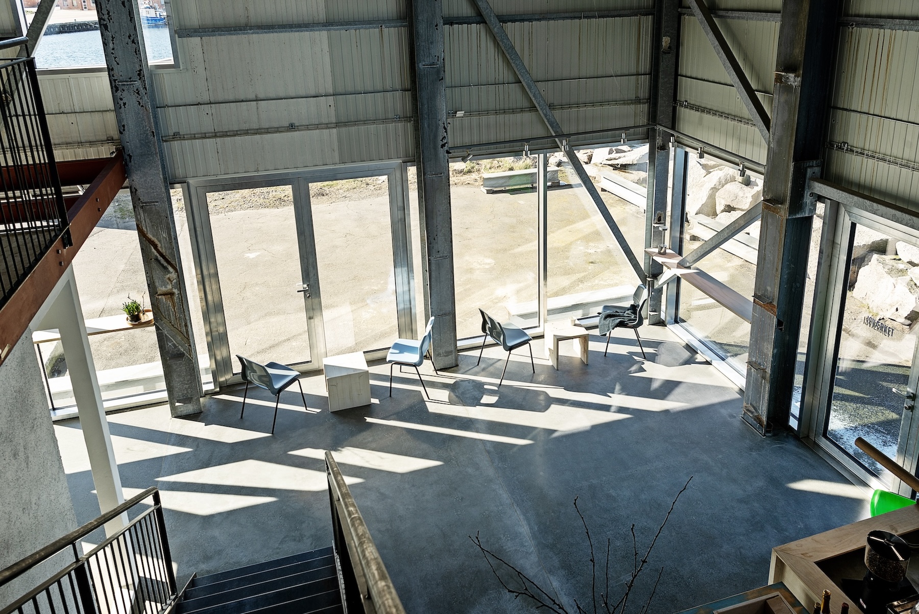 De oprindelige strukturer er bevaret så rå og urørte som muligt. Synlige stålsøjler og stålvægge og poleret betongulv er blevet stærke visuelle elementer i opholdsrummet.