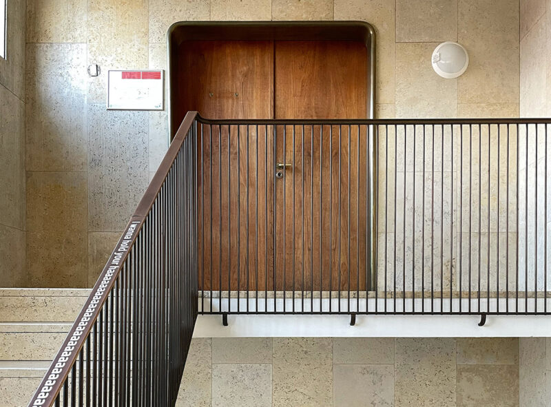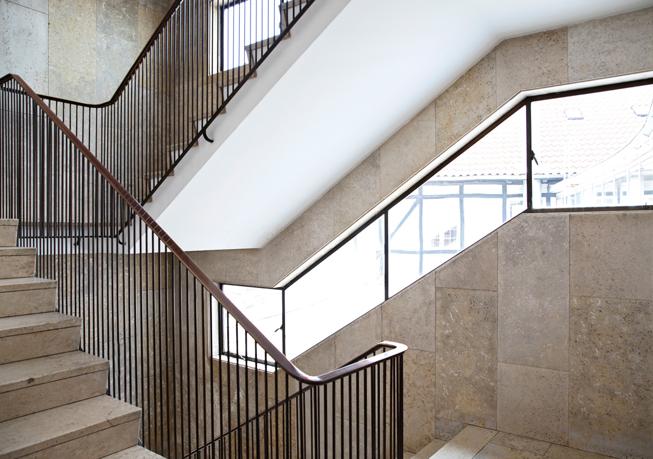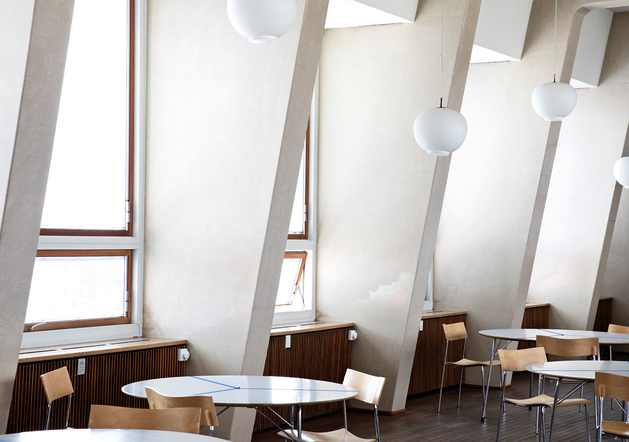 Et er hvad er synligt udefra, men kommer man ind bag fabriksbygningens murer, vil man opleve at det ikke kun var det udvendige, som Arne Jacobsen mestrede. Han tegnede nemlig hele byggeriet både ude og inde – og ned i mindste detalje. Dørgreb, skiltning, belysning og møbler. Alt sammen designet af arkitekten selv og udført i gedigne kvalitetsmaterialer som messing, kobber, teaktræ og travertin (natursten).