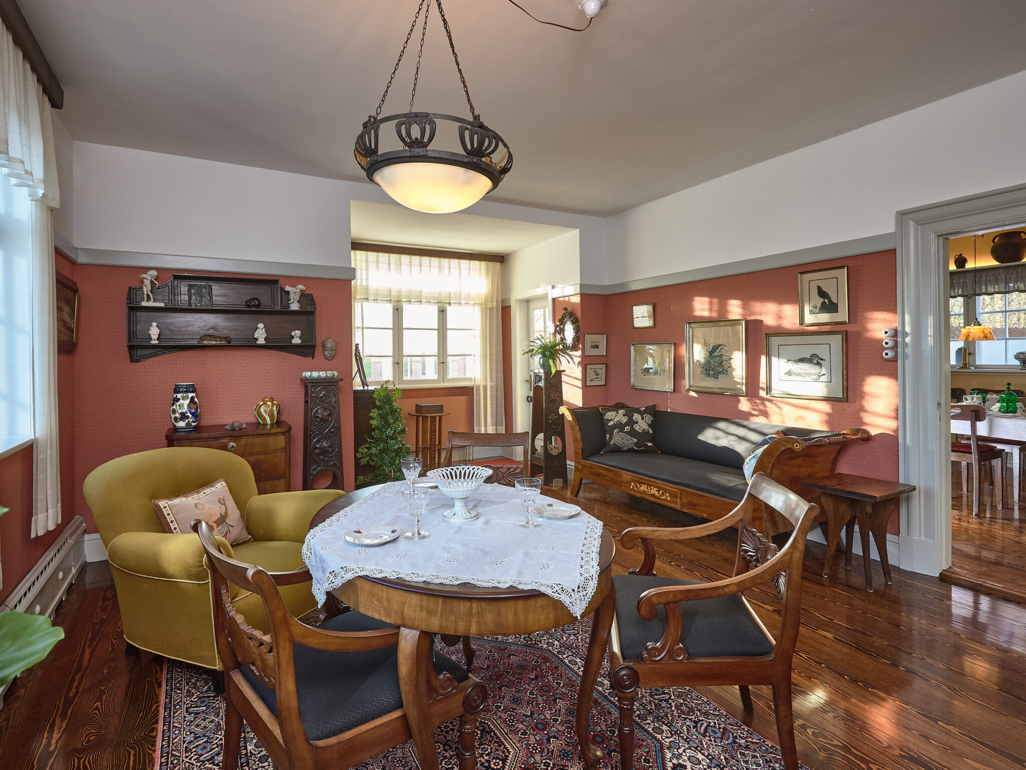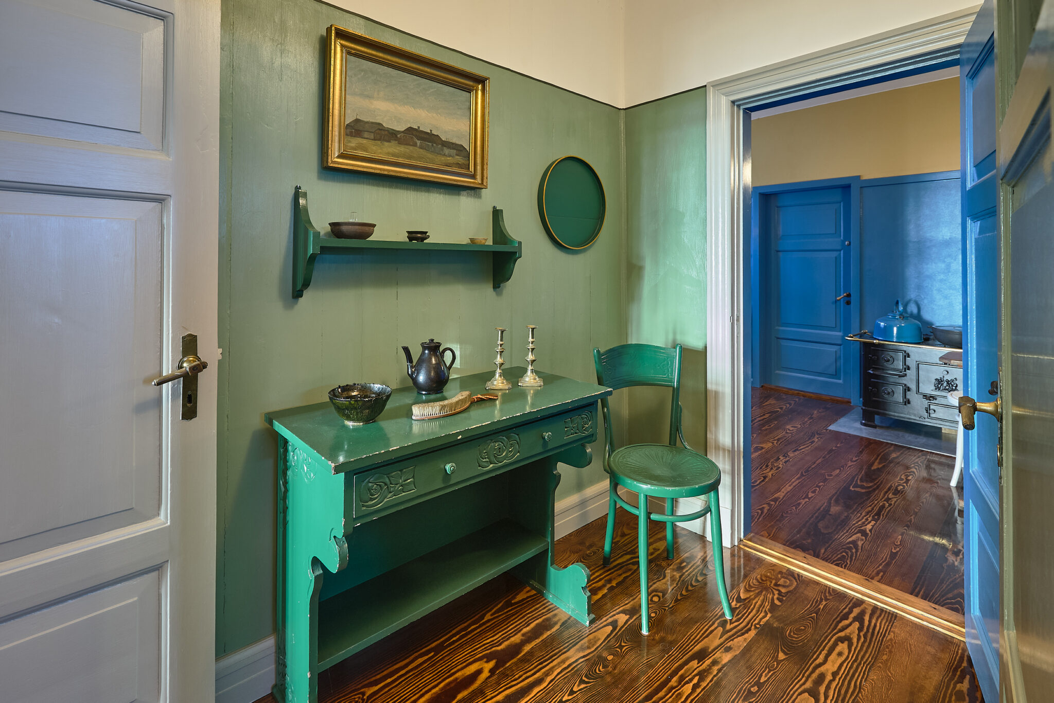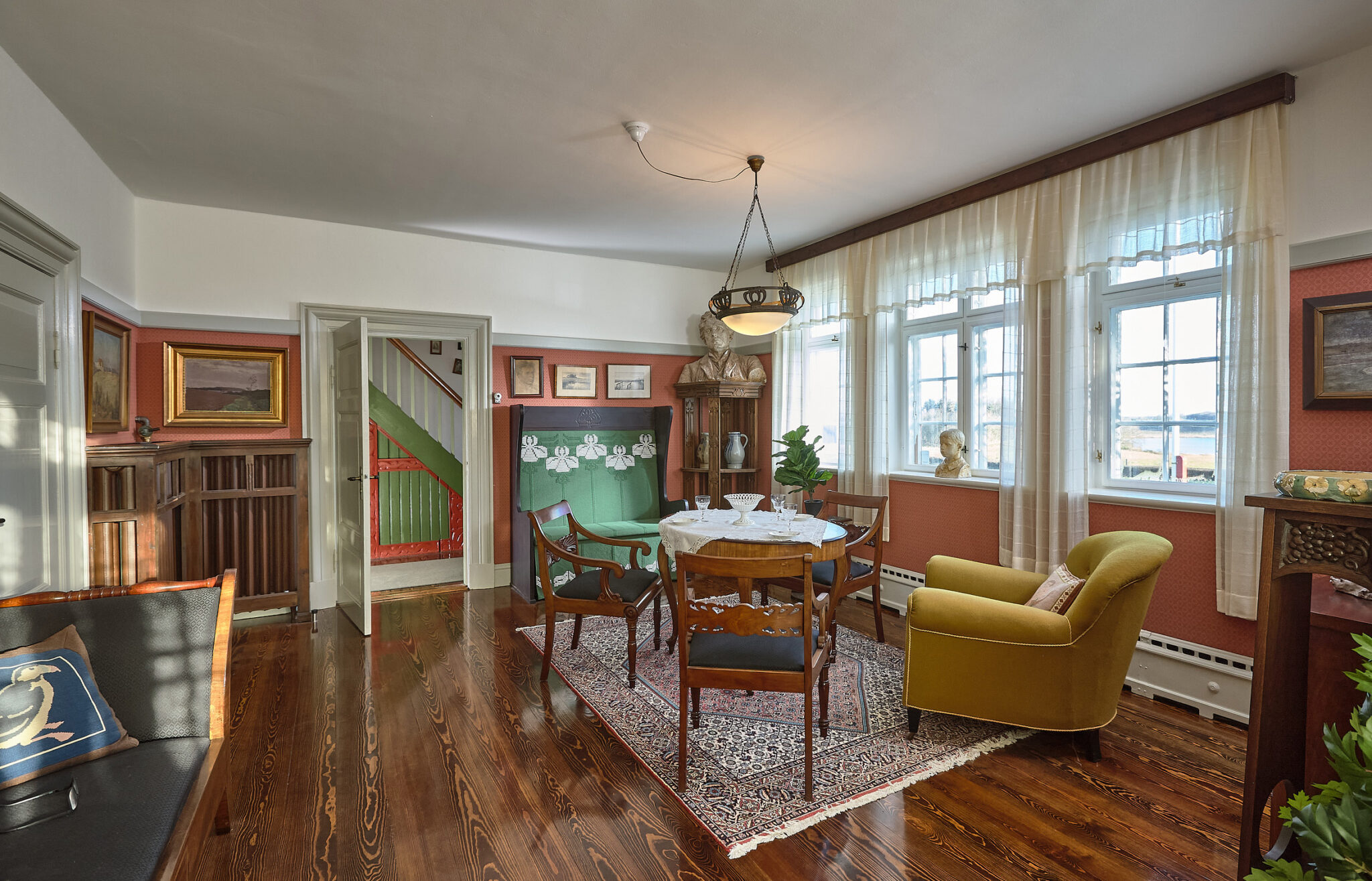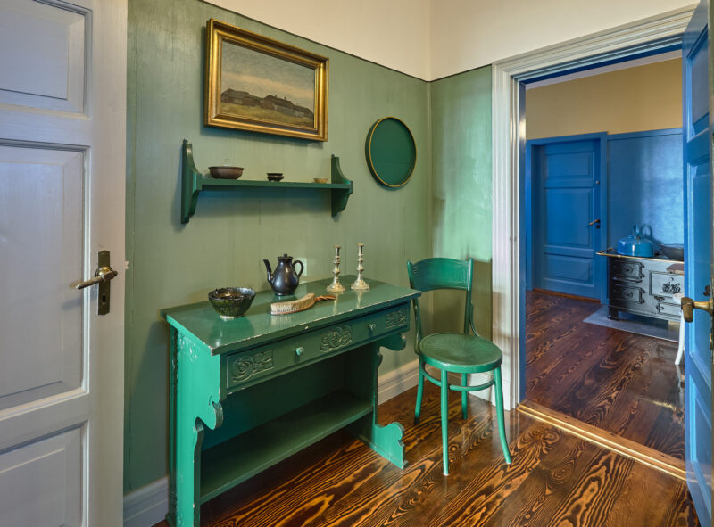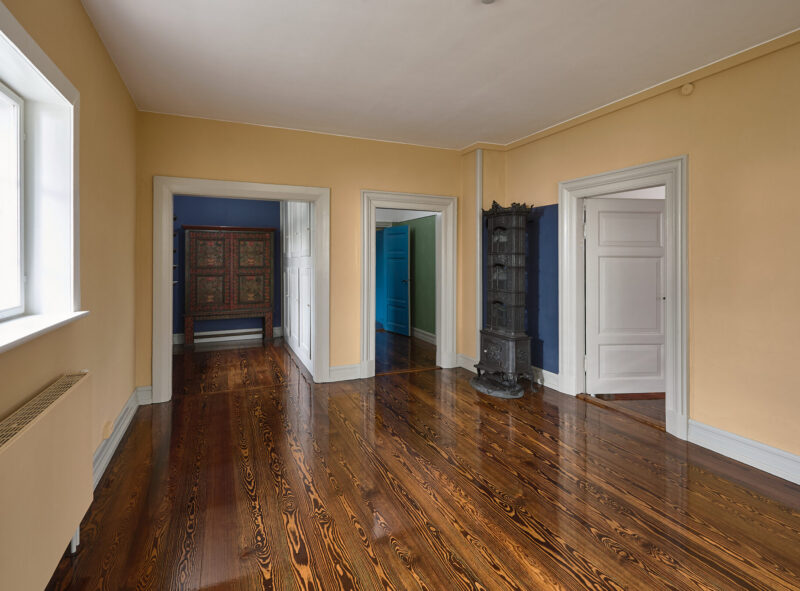 Husets farvesætning er dels en tilbageføring til de historiske farver og dels en abstraktion over tidens idealer, for at skabe en helstøbt oplevelse igennem boligen. Hovedfløj og sidefløj er fra to forskellige perioder, der afspejles i interiørets bearbejdning. Sidefløjen fra 1940’erne fungerer i dag som refugium, der udlejes til ugelange ophold. Denne fløj er på samme måde som hovedfløjen blevet istandsat med en særlig periodebevidsthed, der her viser sig igennem den modernistiske periodes stiltræk, både i interiør og farvesætning.