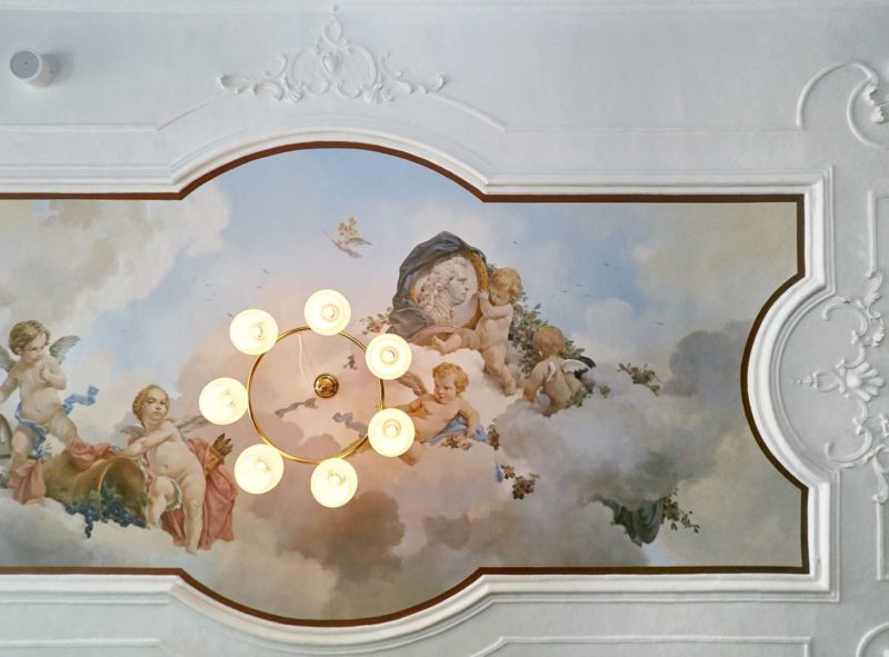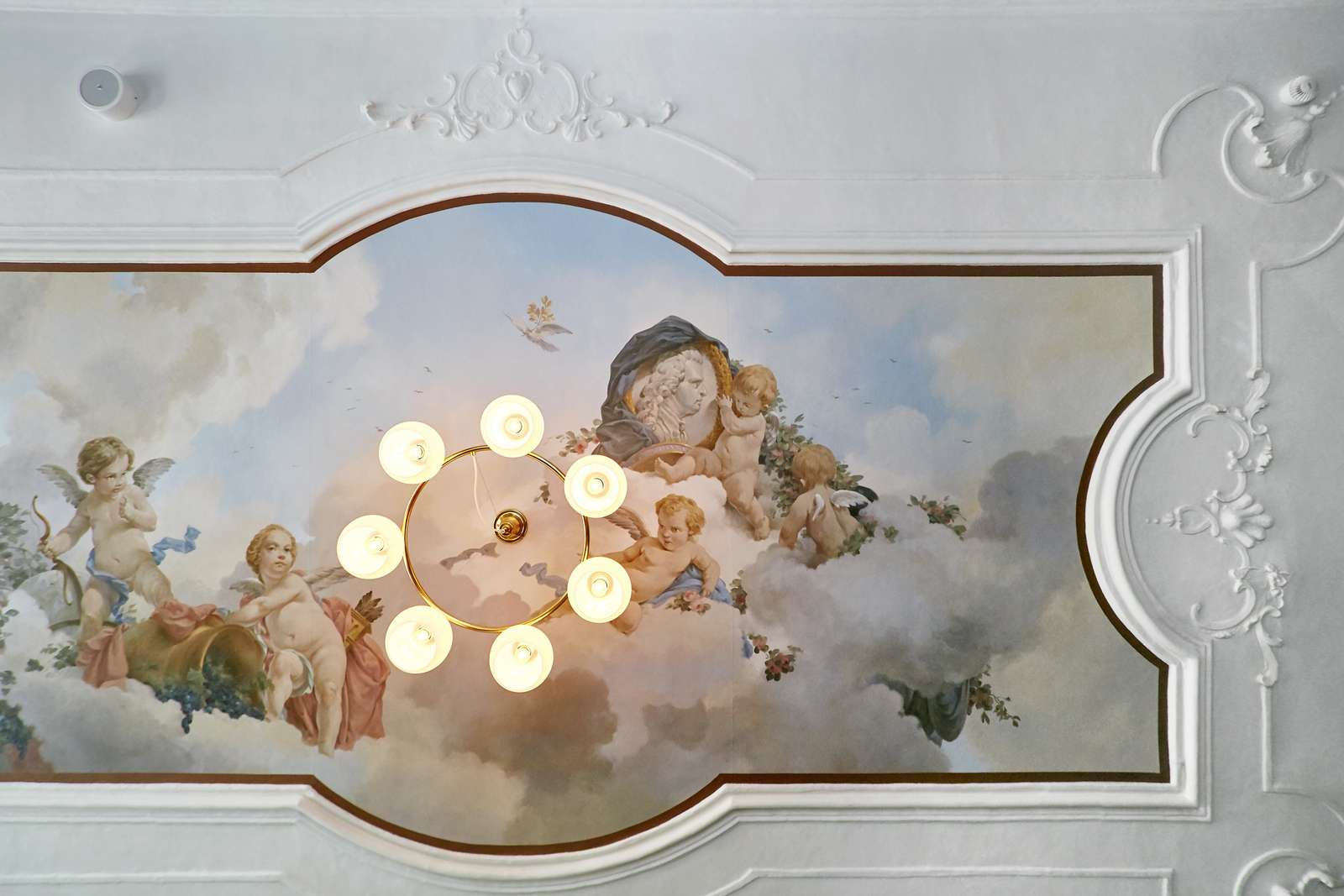“Loftsmalerierne er fra 1744, men gennem årene har man malet lofterne over med lak for at skjule dem – i stedet for at reparere på dem. Nu har vi taget alle lag af og fundet det originale maleri frem, som vores dygtige malere er ved at justere. Det er et imponerende håndværk, som tager tid” har bygherre udtalt. Der har været et fokus på netop dette arbejde også på de sociale medier, det har været spændende at følge.