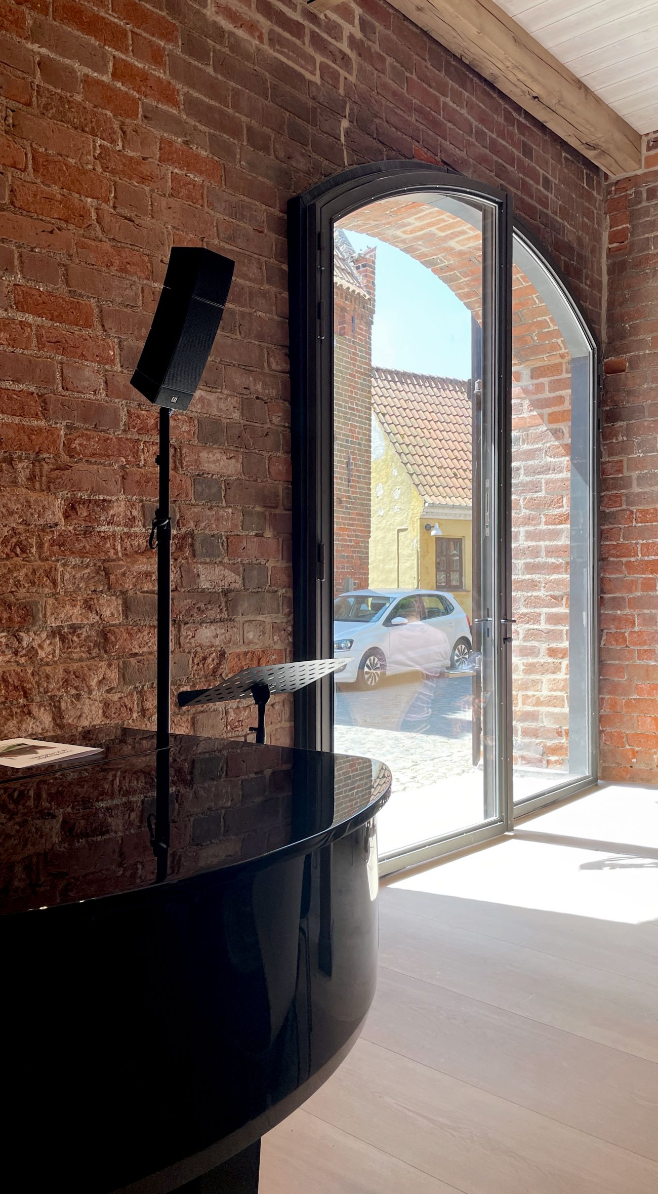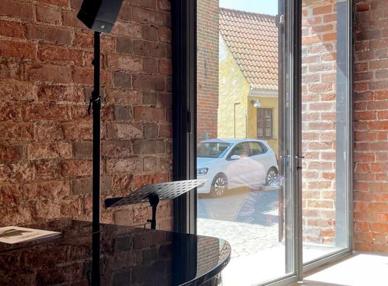 De historiske portåbninger er genetableret med nye revle- og glasdøre, som øger dagslysindfaldet og markerer aksen gennem bygningen – et kulturhistorisk spor efter den tidligere køregang.