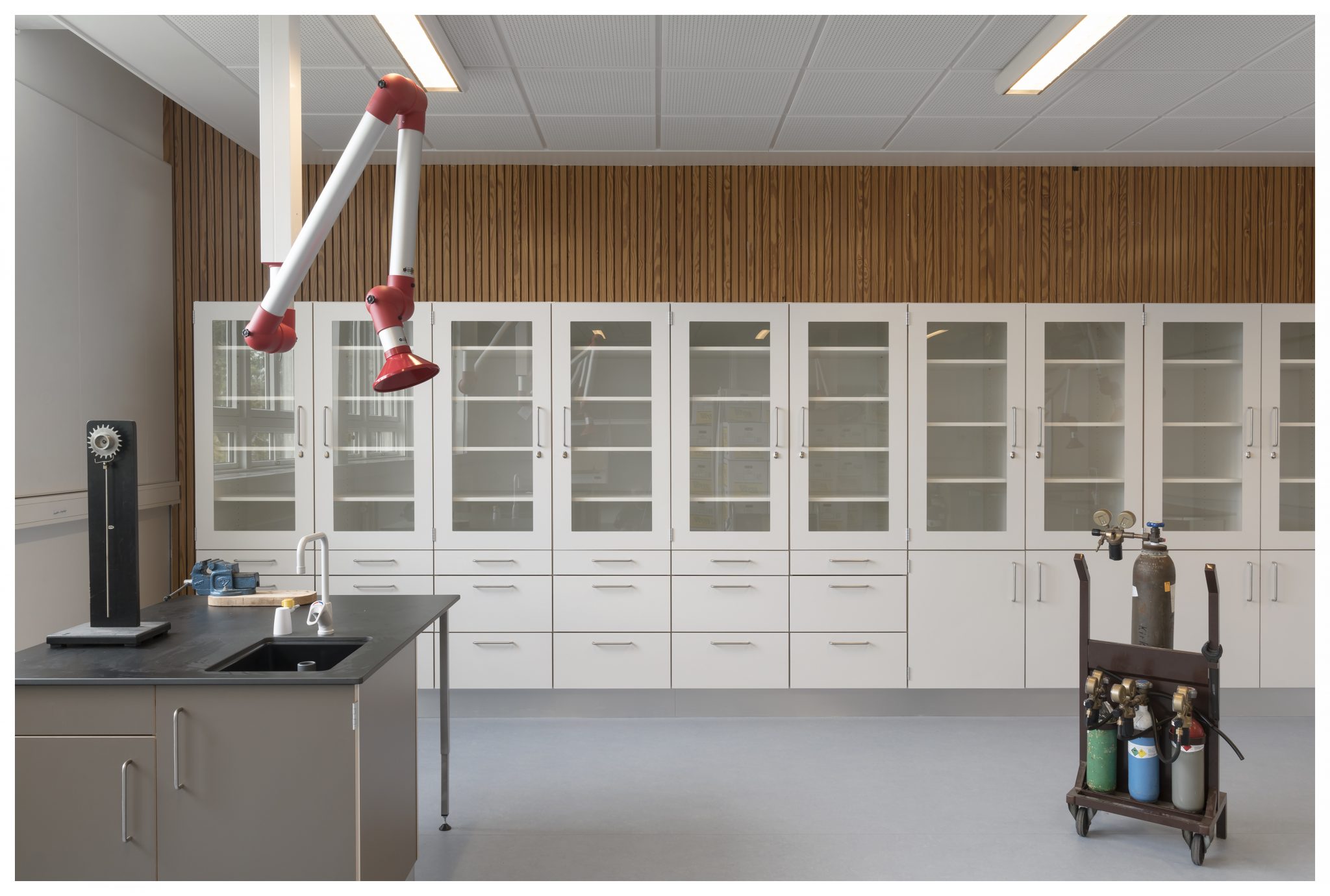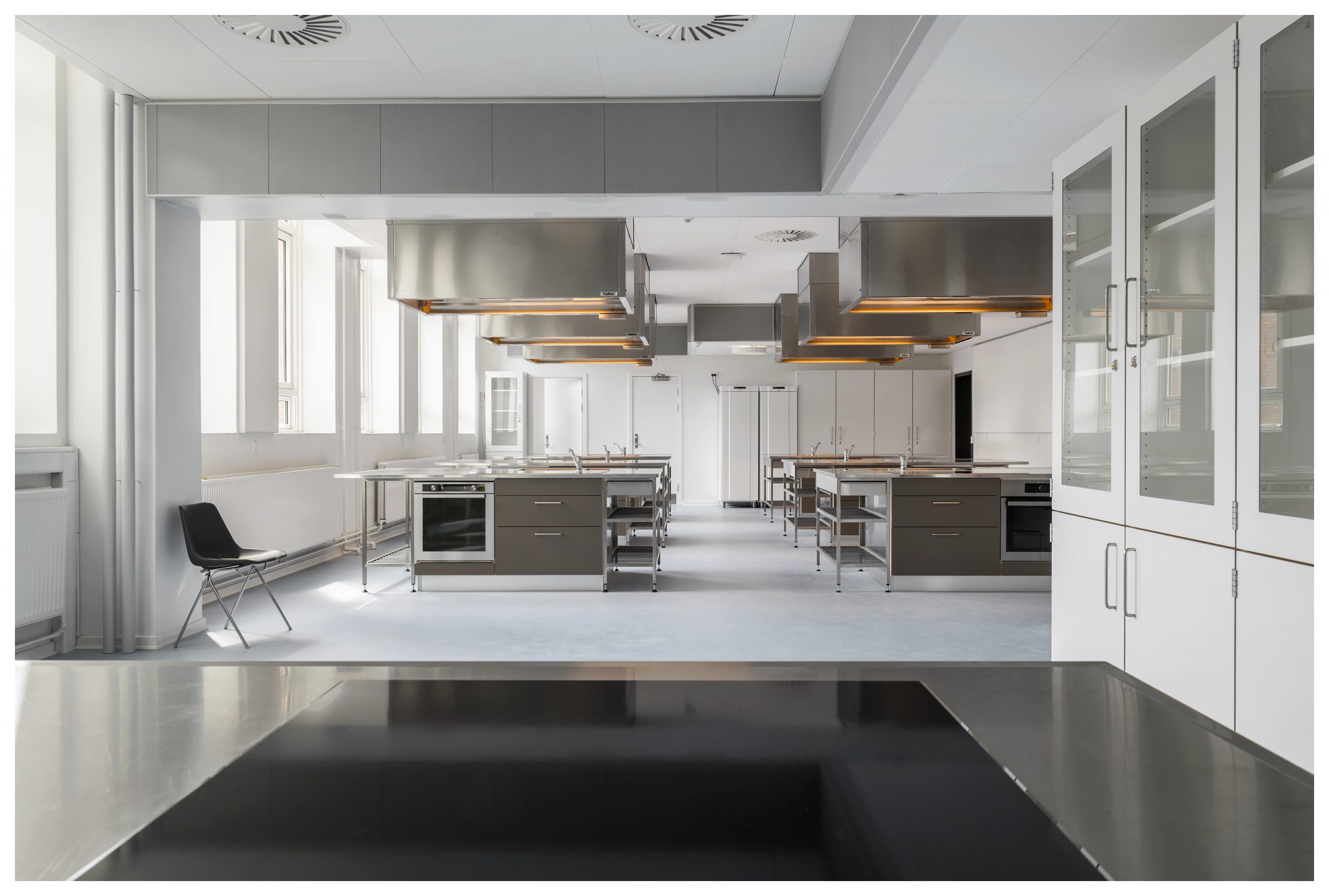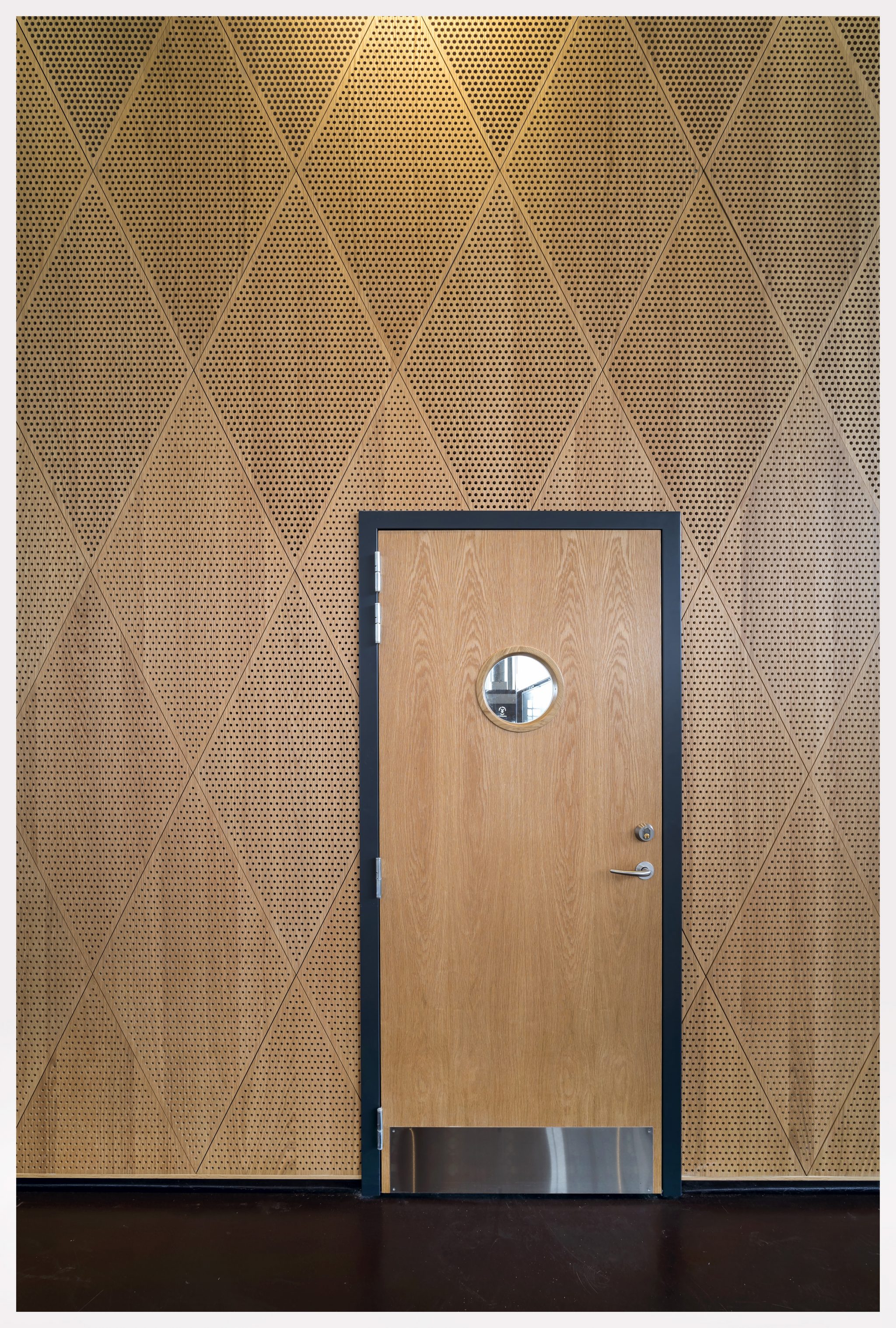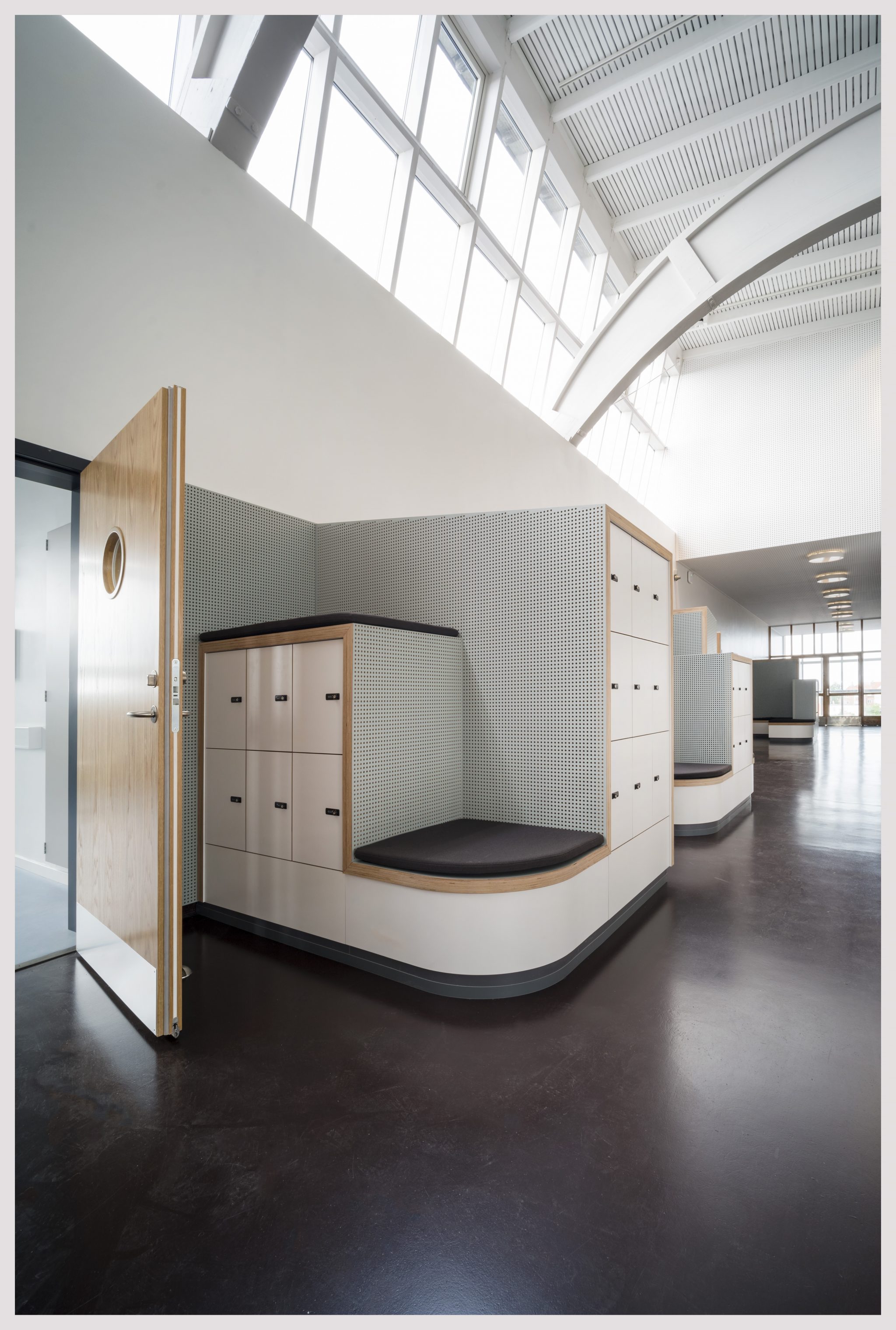 En række af elementerne - rammer i anodiseret aluminium til solafskærmning, integrerede rummøbler og akustikpaneler i det storslåede aularum - er specialdesignet til skolen og er udviklet og udført i tæt samarbejde mellem rådgivere og udførende.