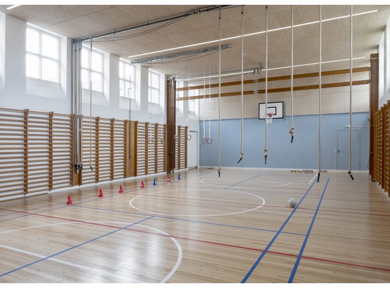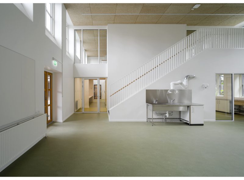 Den bevaringsværdige skole er helhedsrenoveret nænsomt. Samtidig er aulaen og gangarealer til ophold og gruppeundervisning aktiveret.
