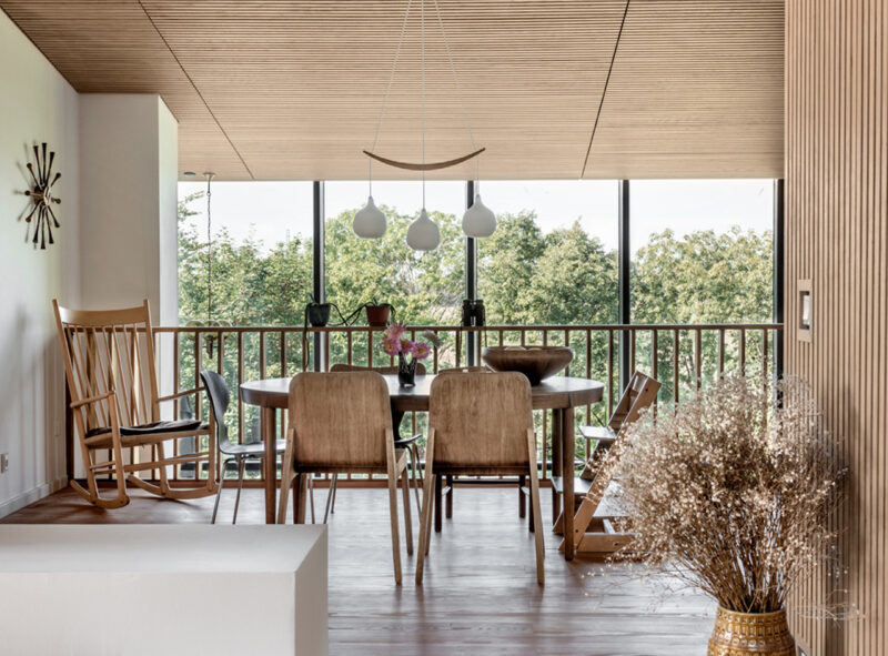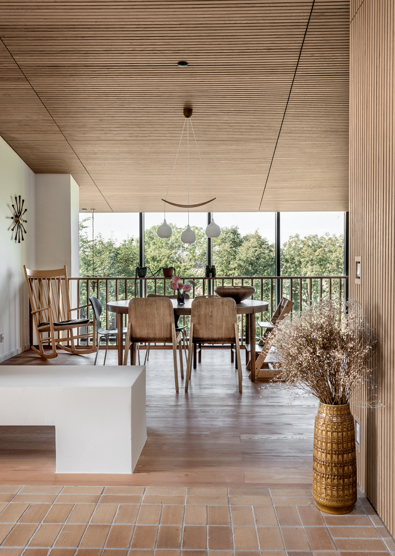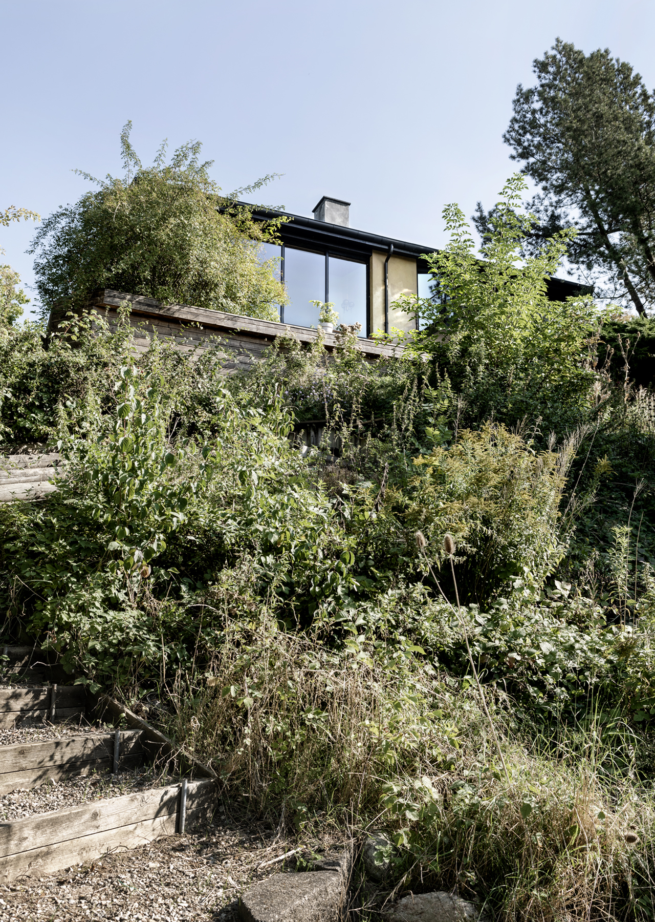 Huset ved skråningen, tegnet af arkitekt Ib Kofod-Larsen og tidligere hjem for forfatter Martin Andersen Nexø, blev for 5 år siden overtaget af de nuværende ejere. Dette skift repræsenterer ikke blot et ejerskifte, men også en dedikation til at bevare og forny et hjem med rødder i kunstnerisk arv. For ejerne, der elsker at følge med i naturen hen over året, er det ikke kun et renoveringsprojekt, men også er en fejring af naturen, og de mærker dagligt glæden ved panoramavinduernes udsigt, som er bevaret i projektet. Den store, nye skulpturelle pejs og det tilpassede køkken er ikke kun praktiske, men skaber også et socialt centrum i hjemmet. Atmosfæren inviterer ind, og fortid og nutid smelter sammen i et nyt kunstværk.