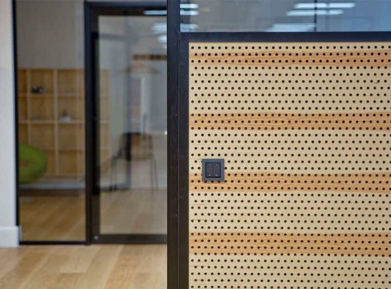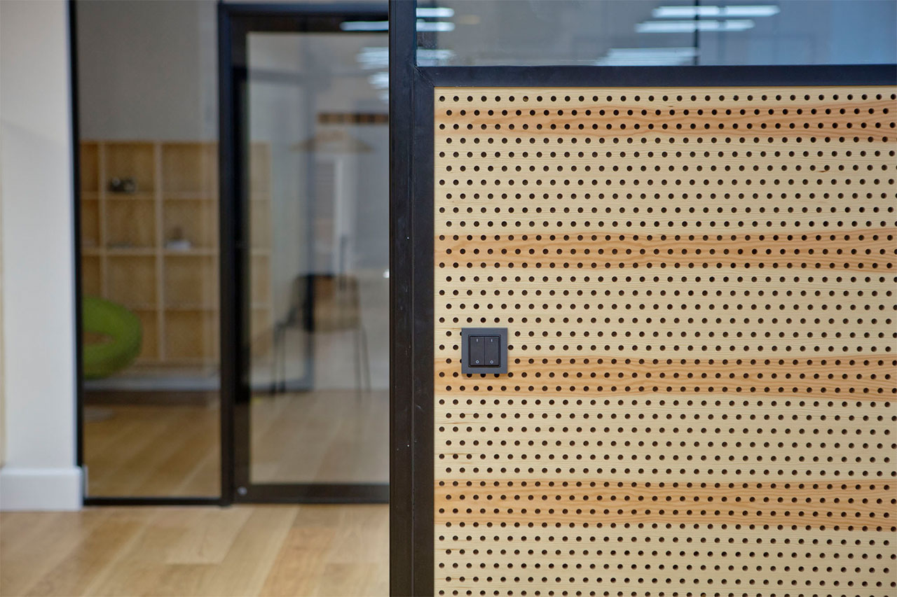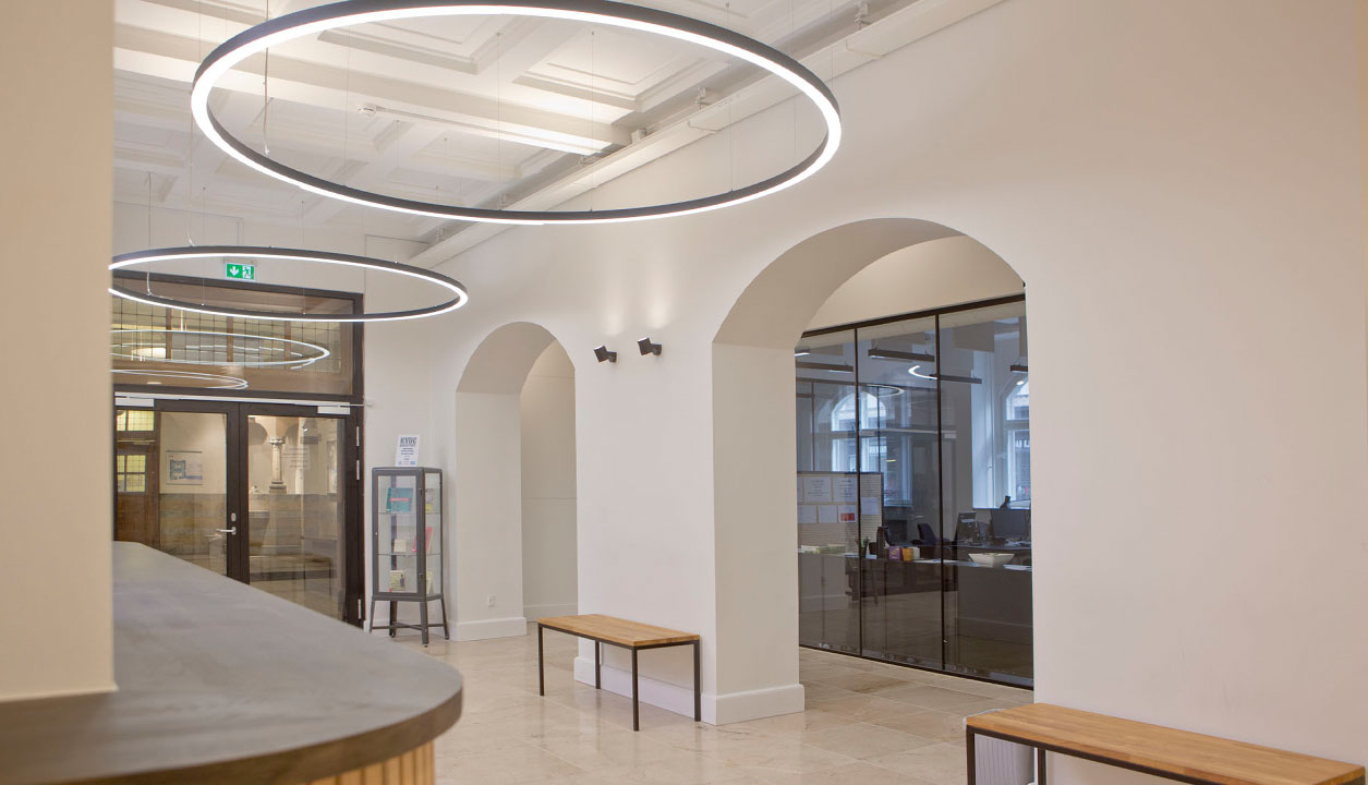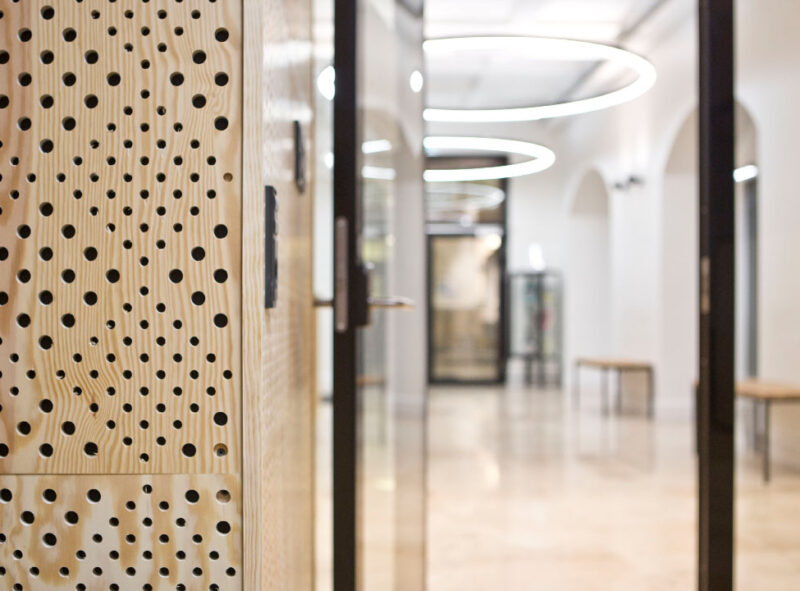 De eksisterende nedhængte lofter er erstattet af et loft, der afslører den eksisterende bygnings smukke kasettelofter, og indarbejder krav til lysforhold, akustikregulering og indeklima i en æstetisk helhed i samspil med den oprindelige bygning. Væggen mod gangene er udformet med en akustikregulerende fyrretræsbeklædning, som er med til at give rummet et varmt og behageligt udtryk.