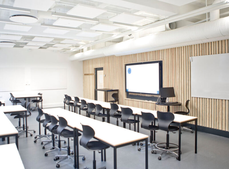 Undervisningslokalerne er skolens vigtigste rum. De er kulminationen på forløbet gennem bygningen, fra hoveddøren, gennem gangene, til klasseværelserne. Rummene er istandsat med fokus på akustik, lys og varme.
