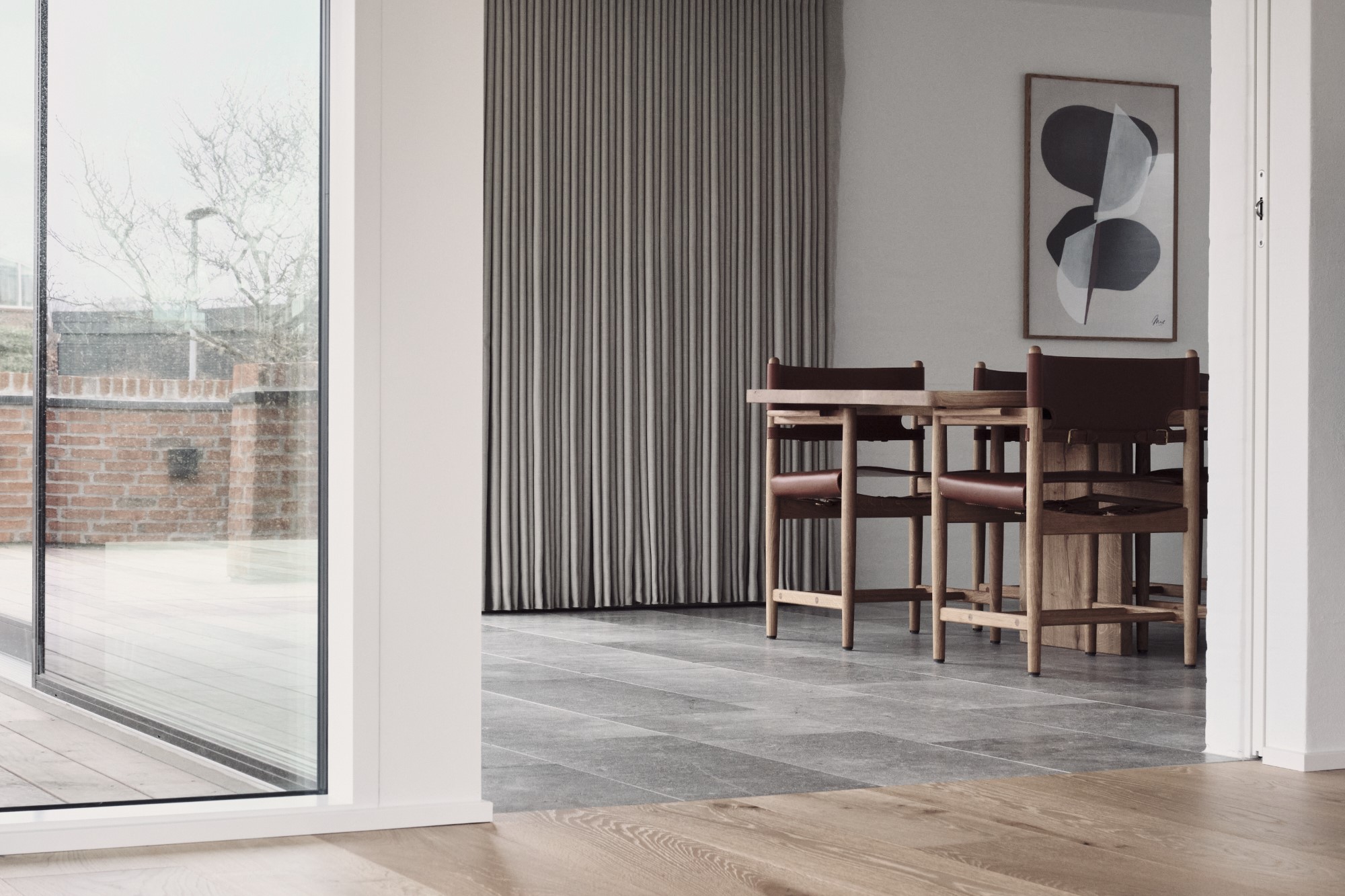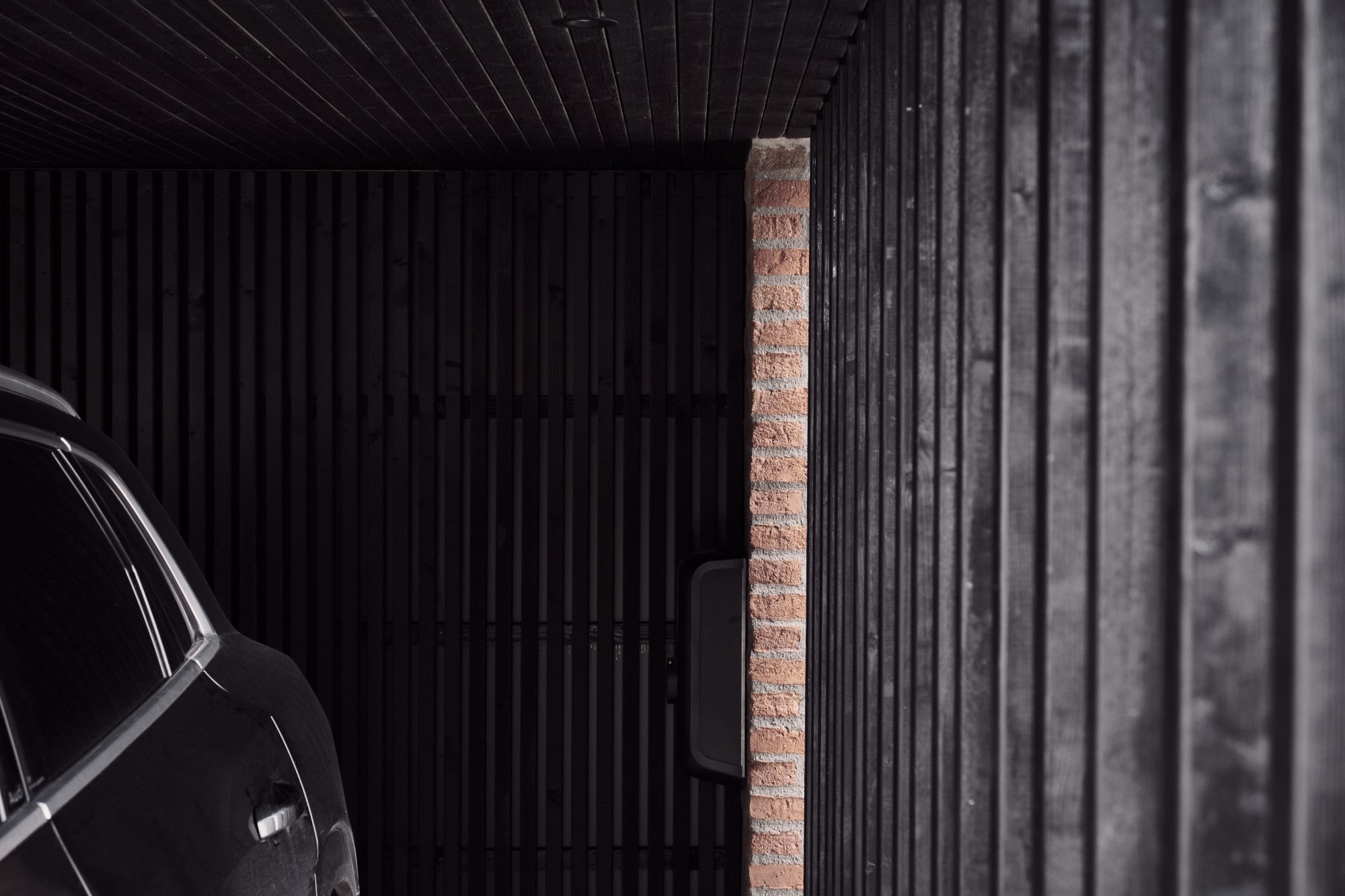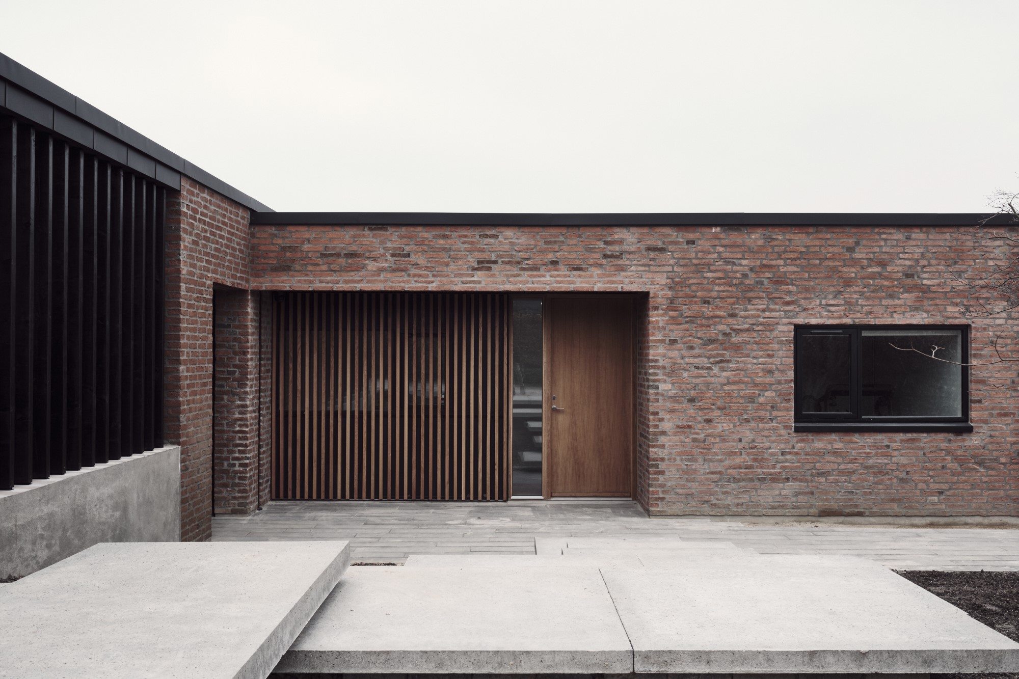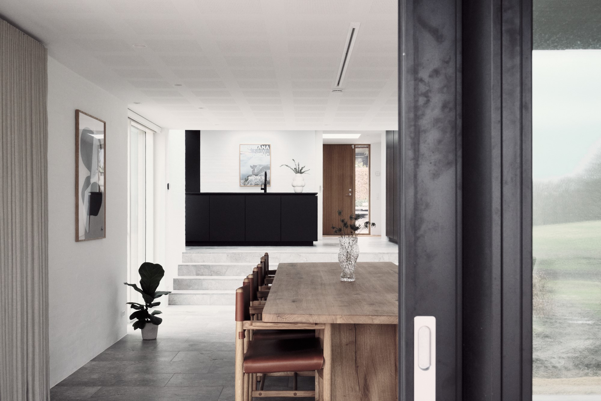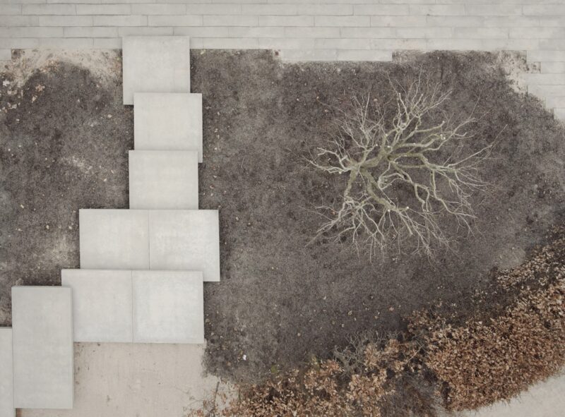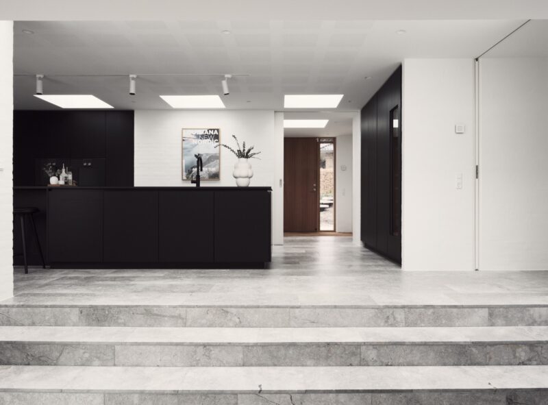Alle funktioner er omdannet i projektet. før parkerede man på en rampe hvor man ikke kunne orientere sig når man bakker bilen ud på villavejen – i det ”nye hus” er parkeringen blevet hævet til niveau med vejen og der er blevet god plads til 2 biler med el ladstandere. Ankomstrummet har fået et følsomt løft med belægninger og nøje planlagt beplantning – det er nu indbydende og inviterende at komme til huset. Entréen er også blevet husets beliggenhed værdig. allerede fra hoveddøren får man et smukt kig til vejle fjord, skov og eng. Der har været havearkitekt på projektet. Havearkitekten har med et enkelt men stærkt greb skabt en sammenhæng mellem husets arkitektur og belægningerne. Huset er kendetegnet ved forskydende skiver og bygningskroppe i forskellige retninger og niveauer – på samme vis er trappetrinene etableret. De slanke trin og det svævende udtryk med vandrette flader/skiver forskyder for hinanden – akurat som huset.