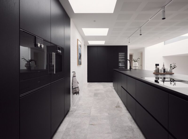Alle overflader indvendigt er blevet renset ned og genopbygget. Gulvene er i opholdsrum opdateret med smukke natursten og i værelser pryder smukke trægulve rummene. Lofter er etableret i gips med fokus på akustik. De akustiske felter er nøje planlagt således linjerne i huset ”går op”.