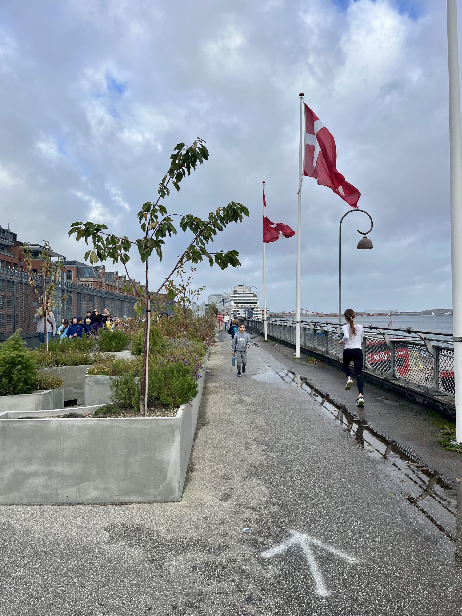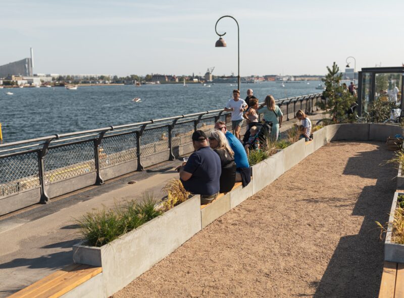 Blikket for brugerne er altså en afgørende del af bygningens arv – fortid og fremtid. Derfor tager renoveringen de besøgende med i udformningen af promenaden især. Før renoveringen lå promenaden gold hen som asfaltørken. Nu mødes de besøgende af grønne haver. Plantekasser i beton med nøje udvalgte kystnære og hjemmehørende planter, der på de 350 meter skaber små opholds- og opdagelsesrum: snapsesti, kyssebænk, strandeng og bærsti. Mellem promenadens to trappetårne står Danmarks længste langbord Langeliniebordet. Intet siger fællesskab som et langbord. Her er alle lige og der er altid plads til en mere. Bordpladerne i beton tegner én lang linje og understreger dermed de arkitektoniske og landskabsmæssige streger. Egetræsstellet med bænke på hver side følger samme linje. Af hensyn til kørestolsbrugere er der flere steder ’huller’ i bænken. Ligeledes har vi opstillet plantekasser med træer, blomster og buske hyld, røn, enebær, og æble m.fl. for at danne små rum langs bordet og skabe intimitet for alle, om man er to, seks eller tredive sammen. På promenadens sidste del ligger to pétanquebaner kranssat med marehalm, fyr og strandarve. Kongstanken med renoveringen af promenaden har været at invitere til folkeliv og fællesskab gennem let genkendelige strukturer, der som en stedsspecifik installation taler ind i bygningens historie. Installationen blev indviet med en stor fællesspisning og i efteråret 2025 så vi første tegn på at lokalområdet tog godt imod installationen: På skolernes motionsdag sad 400 elever fra langelinieskolen bænkede ved langbordet inden de skulle ud på dagens løbetur.