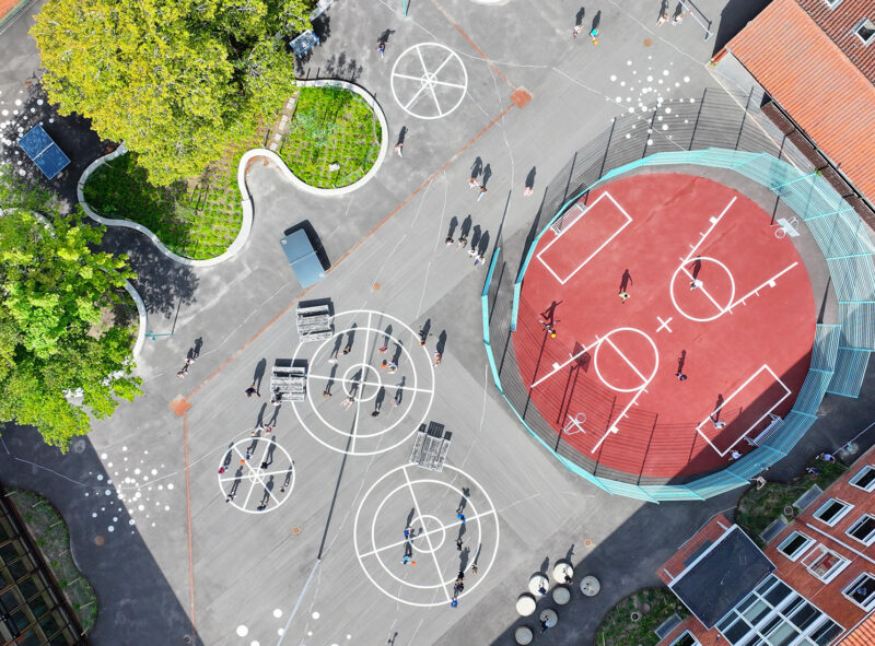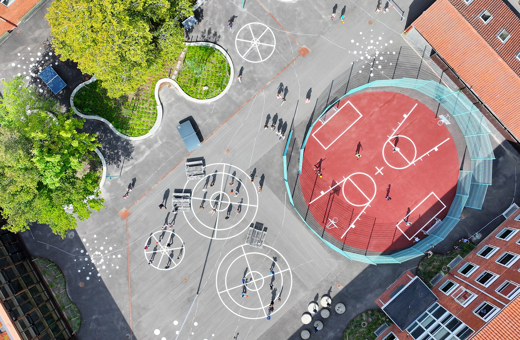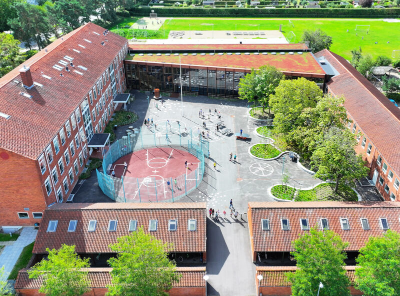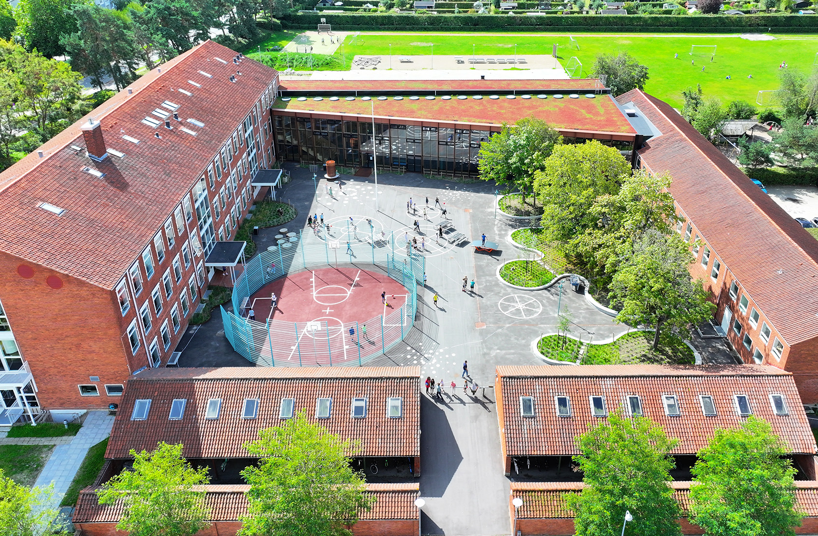 Skolegården er nu omdannet til et kemifrit område, rigt på nye muligheder for bevægelse og designet således, at både skolens elever og brugerne af kulturhuset kan nyde godt af de udendørs faciliteter. Blandt de mange tiltag er tilføjelsen af ventekampesten for ophold, bevarelse af alle eksisterende træer, Bevarelse af skulpturer og granitbelægninger, genplacering af eksisterende møllehjulssten og en ny, fantasifuld og visuelt tiltalende boldbaneafgrænsning, der fra en afstand ligner en sky.