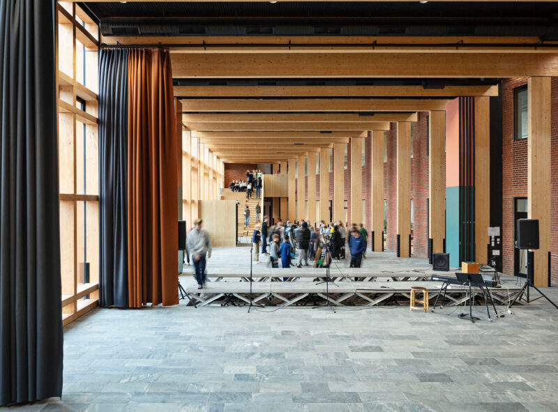 Facaden arbejder med genkendelige dimensioner fra de øvrige skolebygninger, men er samtidig med sine store vinduespartier sin egen – og en åben invitation til at komme indenfor. Den fleksible indretning af det åbne rum i det nye kulturcenter betyder, at det både kan rumme større arrangementer med op til 350 personer og flere mindre arrangementer på samme tid. Endeligt bliver rummet anvendt som en del af det varierede læringsmiljø i skoletiden. Kulturcentrets hovedindgang er placeret centralt, så bygningen optræder som naturligt ankomstområde og er tilpasset det eksisterende byggeri i en takt, der spiller sammen med de oprindelige bygninger.