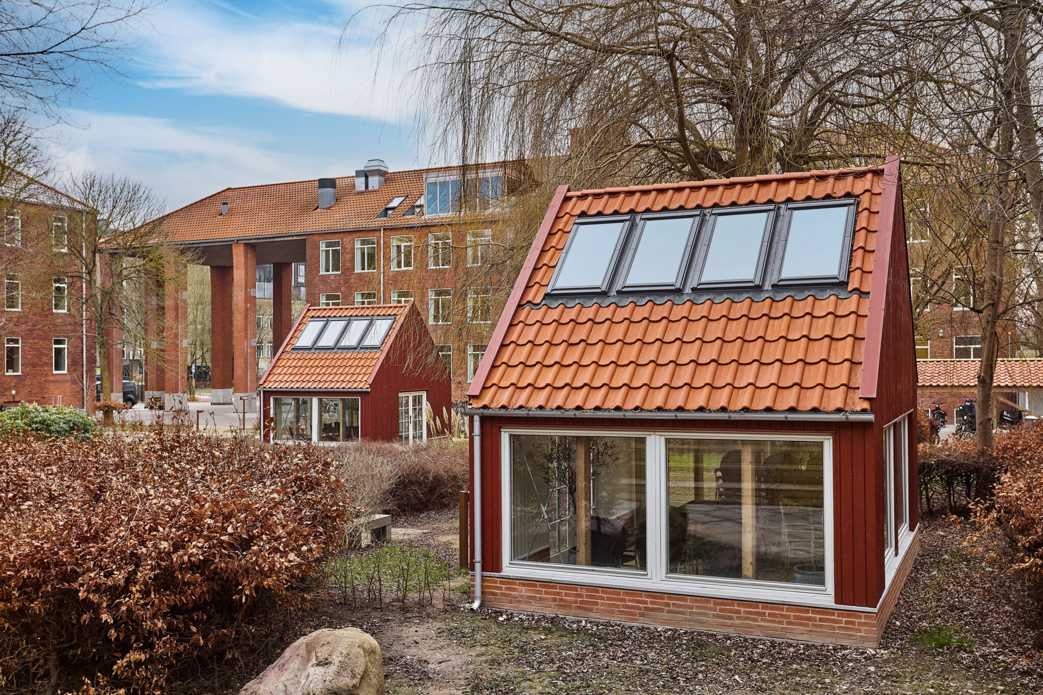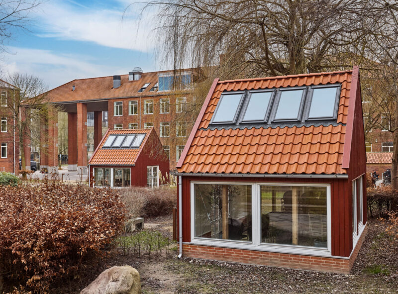 Tegl: På cykelskurene i gården er monteret tegl fra det eksisterende tag, hvor vi har isat nye kviste.