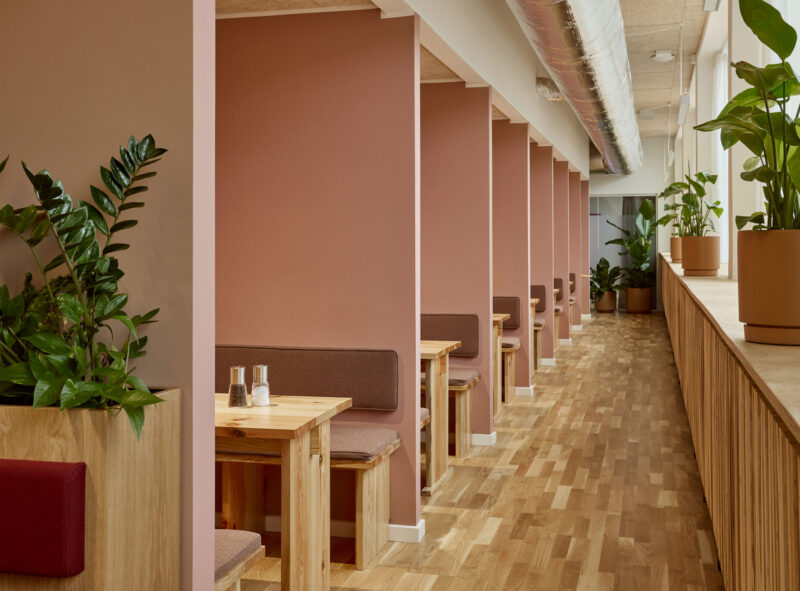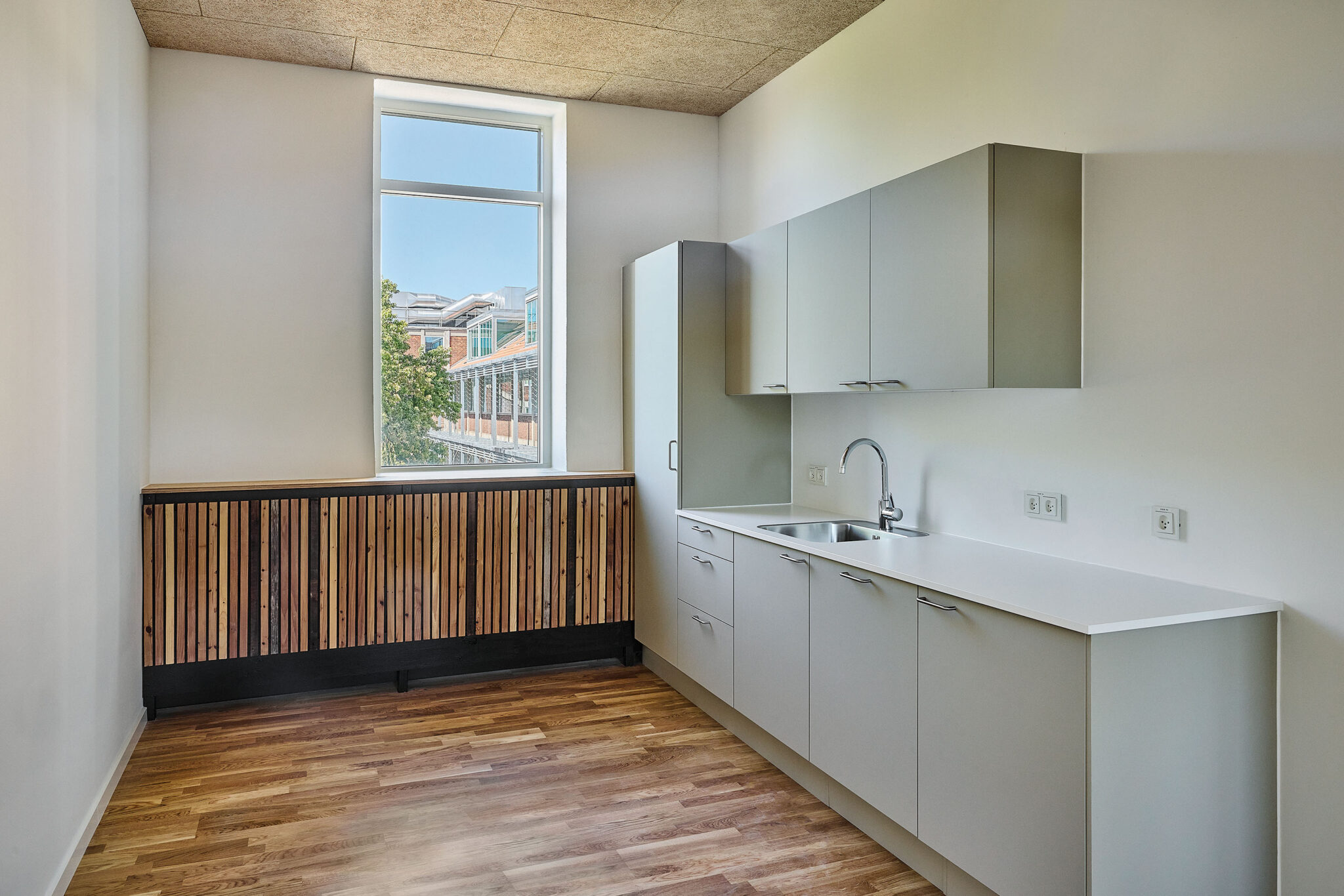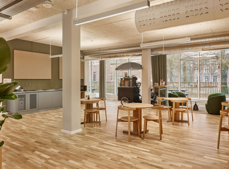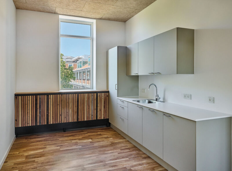 Når målet har været at bevare så meget som muligt, har vi – hvor muligt – genbrugt de bygningsdele, vi udskiftede i interiøret. F.eks. har de gamle vinduer fået nyt liv i pavilloner i gårdrummet. Genbrugstanken er også implementeret og synlig for husets brugere i interiøret, der er præget af radiatorskjulere i genbrugstræ, der giver rummene sanselighed og identitet og som minder brugerne om skønheden og værdien i at genanvende. På den måde bliver radiatorskjulerne formidlere af genbrugstanken i brugernes hverdag.