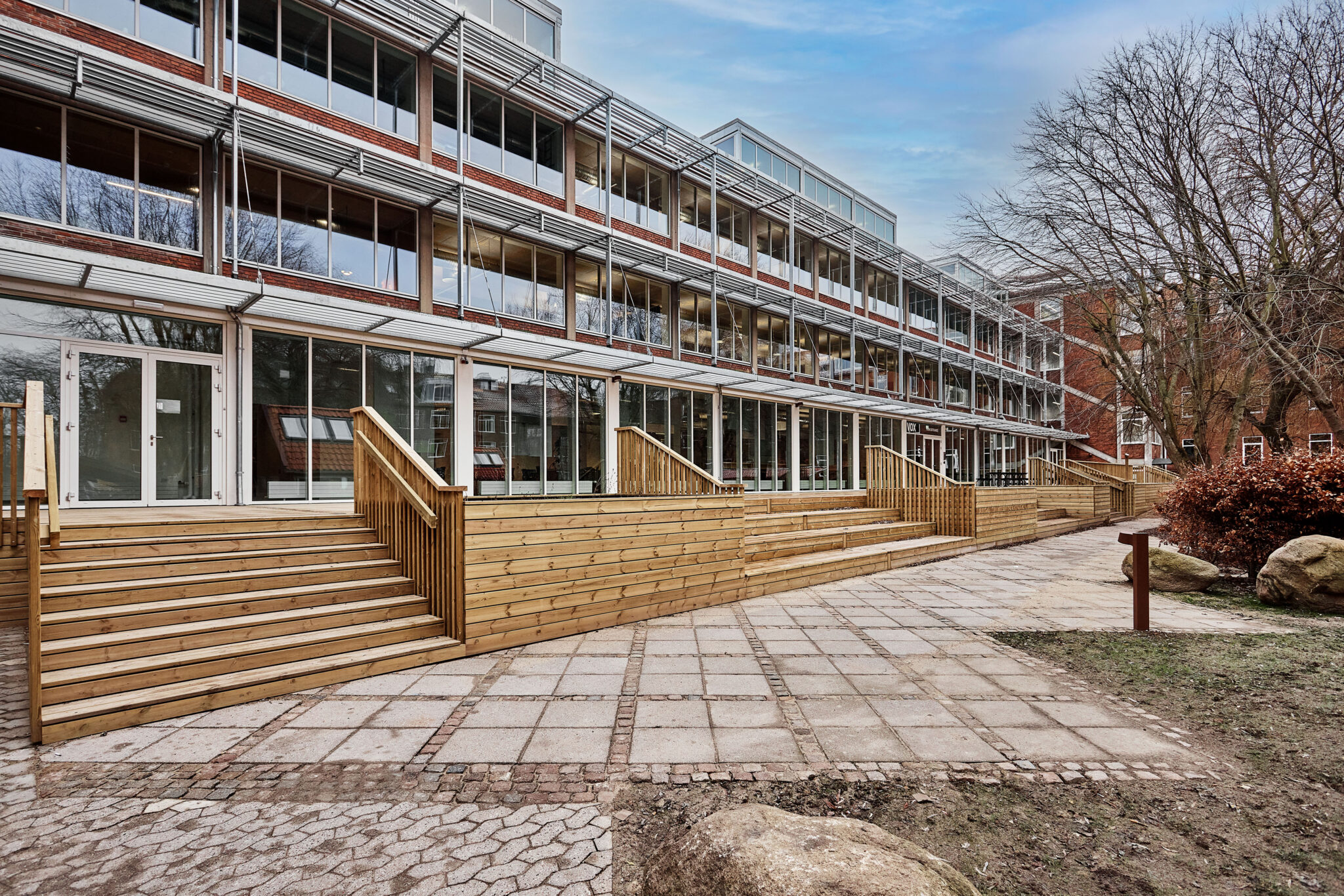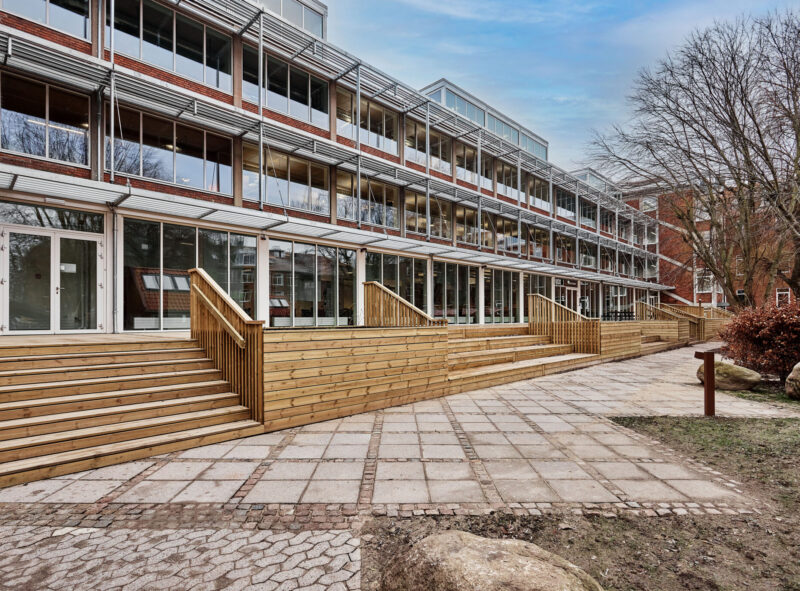 Transformationen har samtidig blik for husets vigtige udeområder. Her har vi taget afsæt i de eksisterende forhold og forstærket dem i en terrasse, der giver mulighed for ophold og udsyn til livet i gårdrummet. I overgangen mellem terrasse og gårdrum er der etableret plinte og plantekummer, som er med til at skabe mere intime opholdsmuligheder og klart definerede zoner. Fra det udendørs ophold på plinten er der direkte forbindelse til kantine/torvet. Langs stier sikrer belysning et behageligt og trygt område – også efter mørkets frembrud. For at forlænge havens brug gennem hele året, er der etableret to pavilloner, der begge er opført i genbrugsmaterialer.