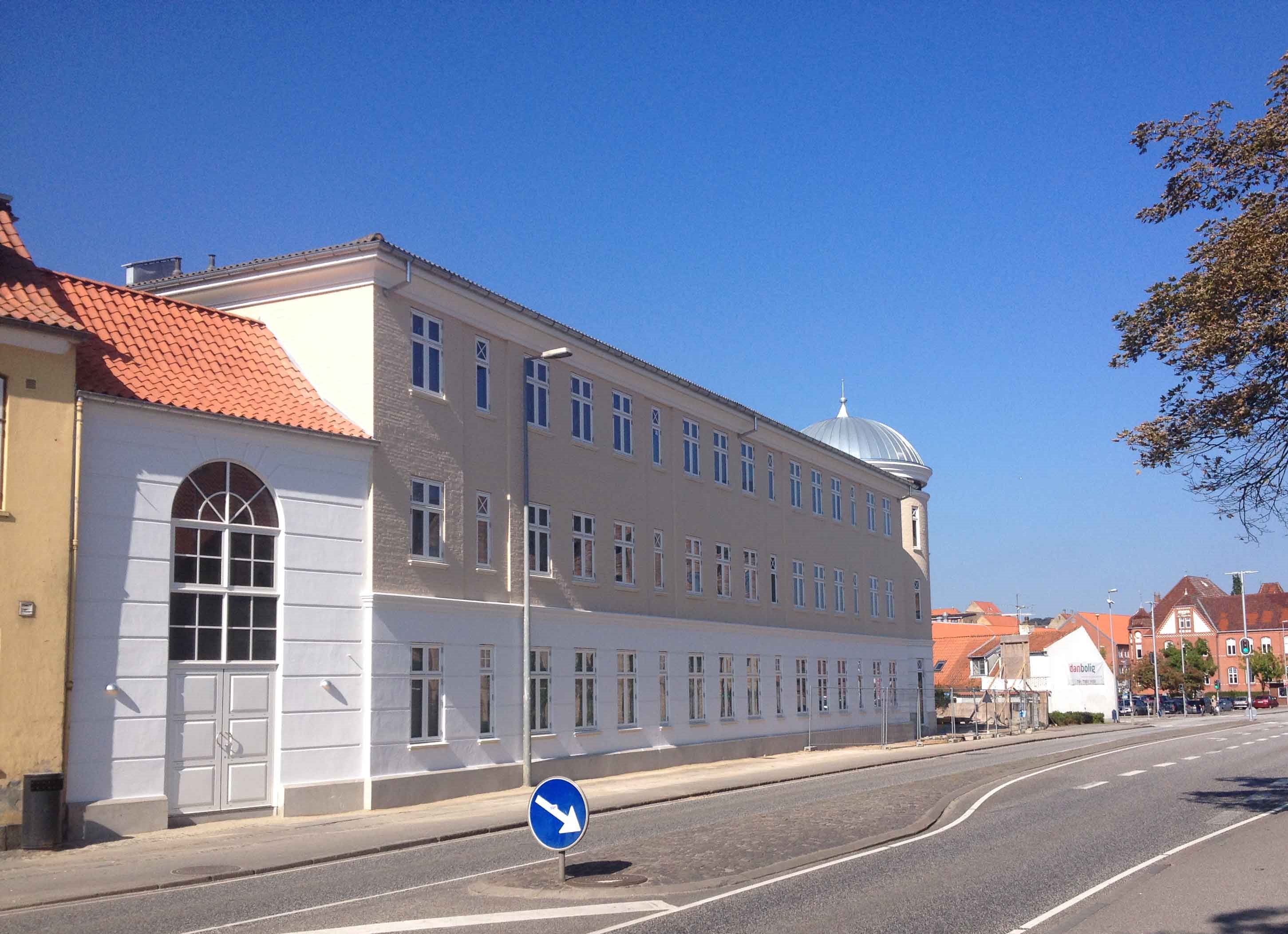 foyer, trapperum og nye toiletfaciliteter for mediehuset. Facader er teglsten med gesimser og facadepuds som er malerbehandlet sammen med de øvrige eksisterende bygninger.
