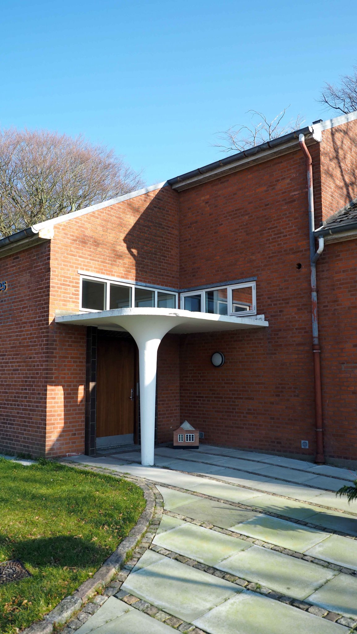 Husets indgang kunne have referencer til Arne Jacobsens Texaco tankstation fra 1937.