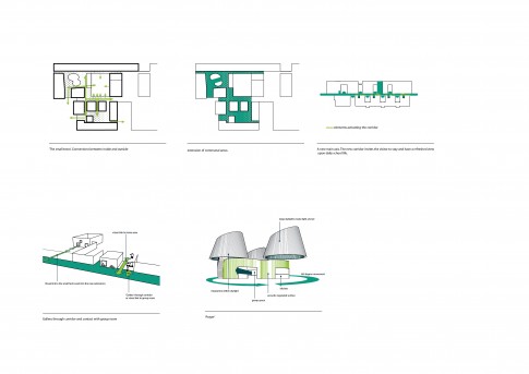Projektet skaber sammenhæng mellem potentialerne i de gamle teglstensbygninger og mulighederne i de nye rammer, der også anvender tegl som gennemgående byggemateriale, men som også introducerer dybe kompositvinduesrammer til ophold og brugen af lodrette Kerto strøer indvendigt.