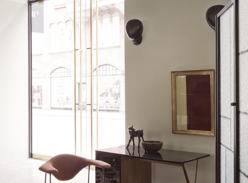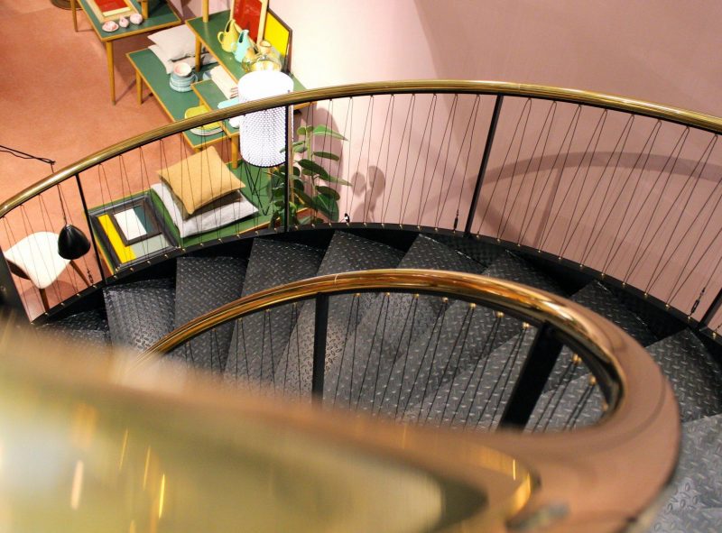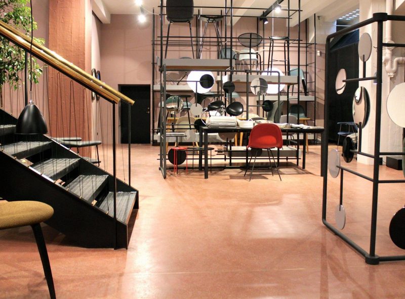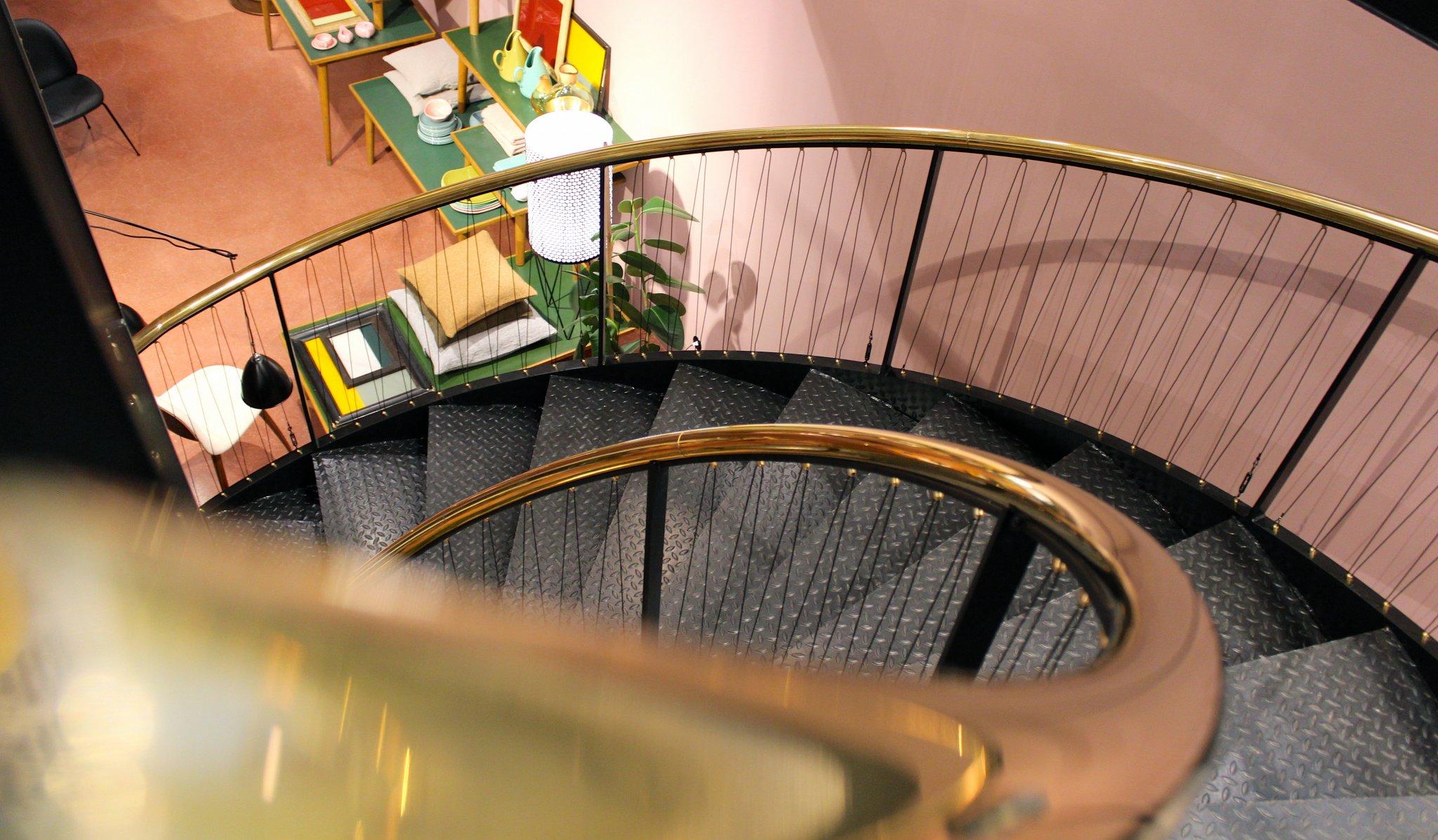 Det originale terrazzogulv på butikkens øverste etage er suppleret med en mosaikbort, som giver gulvet en mere distinkt karakter. Der er designet og etableret en ny, central trappe i samme kontrastfyldte spil mellem det rå og det raffinerede som resten af rummet, mens væggene er malet i en sart farveskala i højglans.
