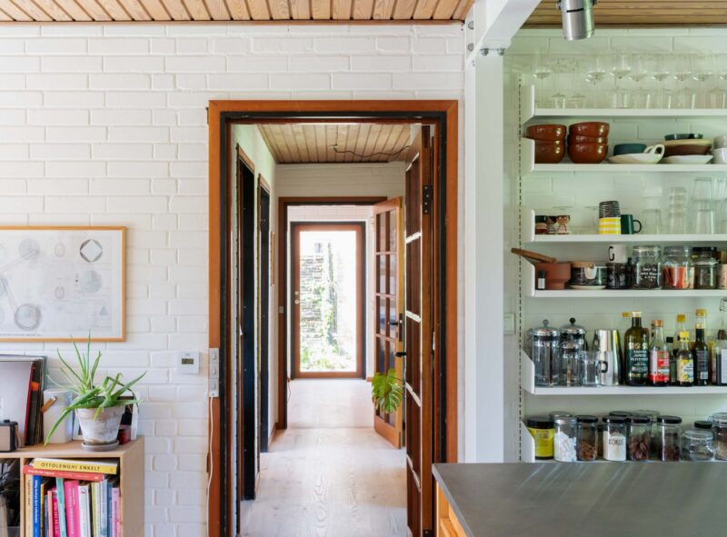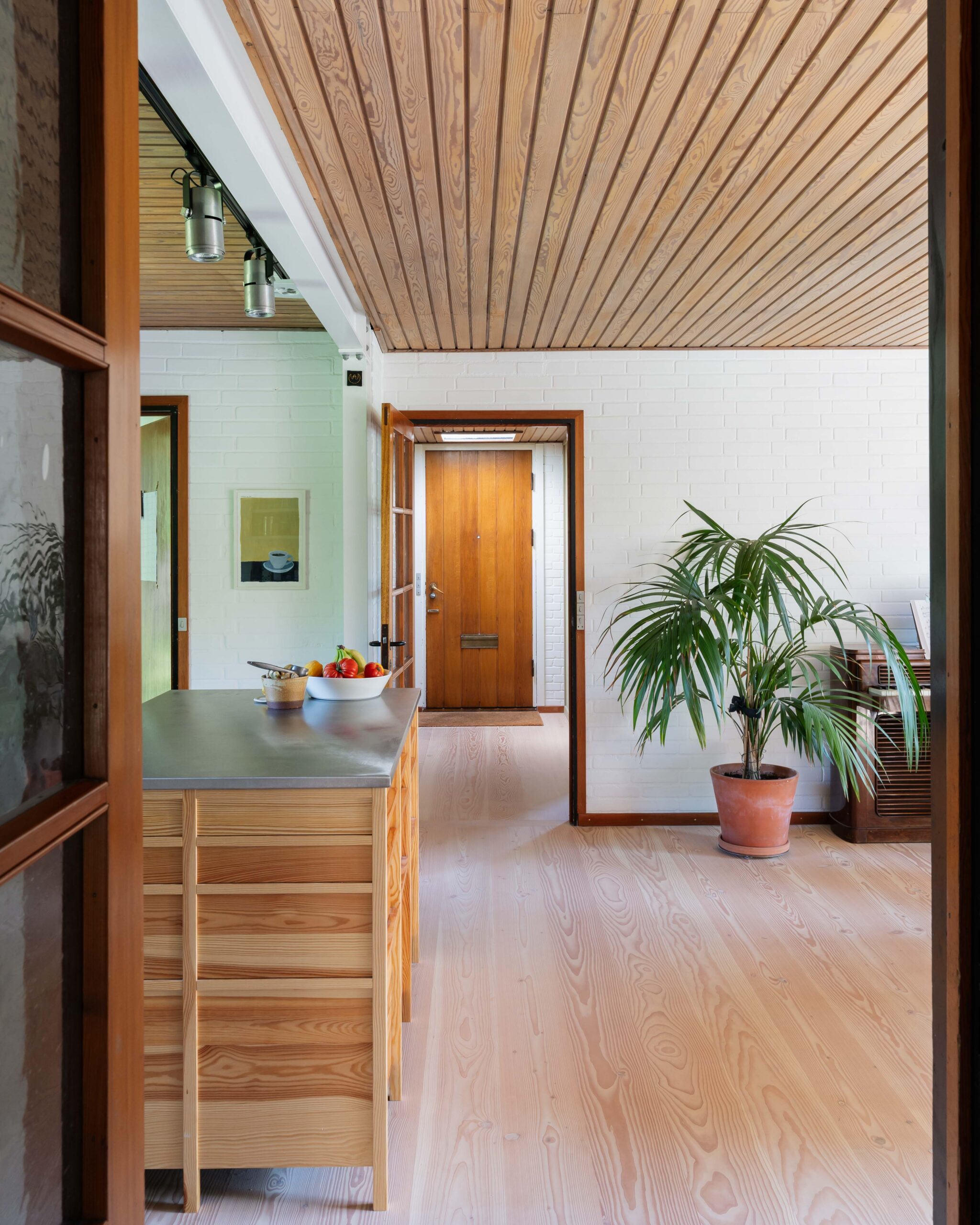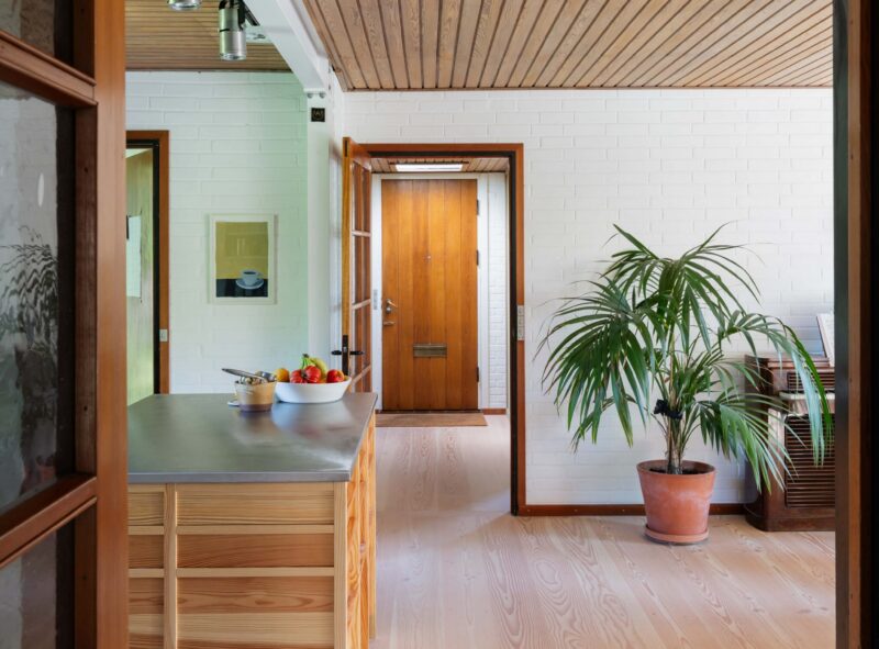 De nye indbyggede garderobe- og tøjskabe i entreen og i soveværelset, samt køkkenøen er ligeledes udført i Douglas – Køkkenøen i genbrugs Douglas fra GENBYG, mens den rødmalede køkkenvæg er monteret med de originale køkkengreb, som er pudset og poleret. Lysarmaturerne i køkkenet er upcyclede lamper fra Fischer Lighting.