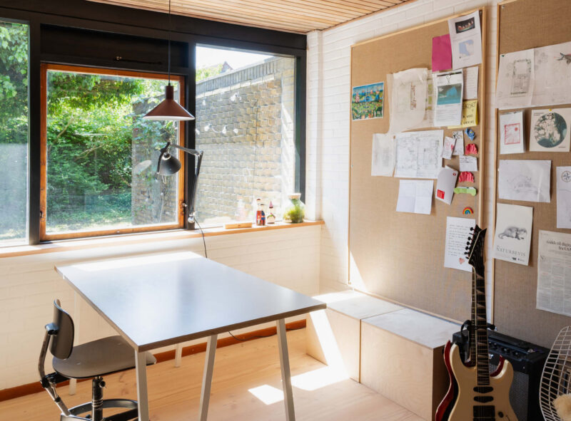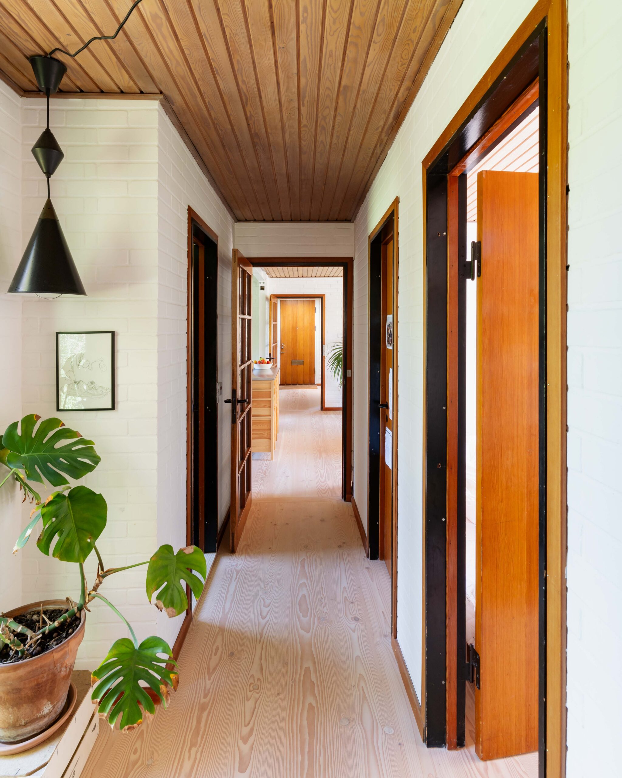 Vi er gået til dette projekt med ønsket om at genbruge som meget som muligt, og anvende upcyclede og biogene materialer, når der skulle tilføjes nyt. Derfor har alle fodpaneler, indvendige døre og karme, samt indbyggende skabe, været demonteret slebet, olieret og genmonteret, efter der var lagt nyt gulv i hele huset. De oprindelige trælofter er vasket ned og bevaret.