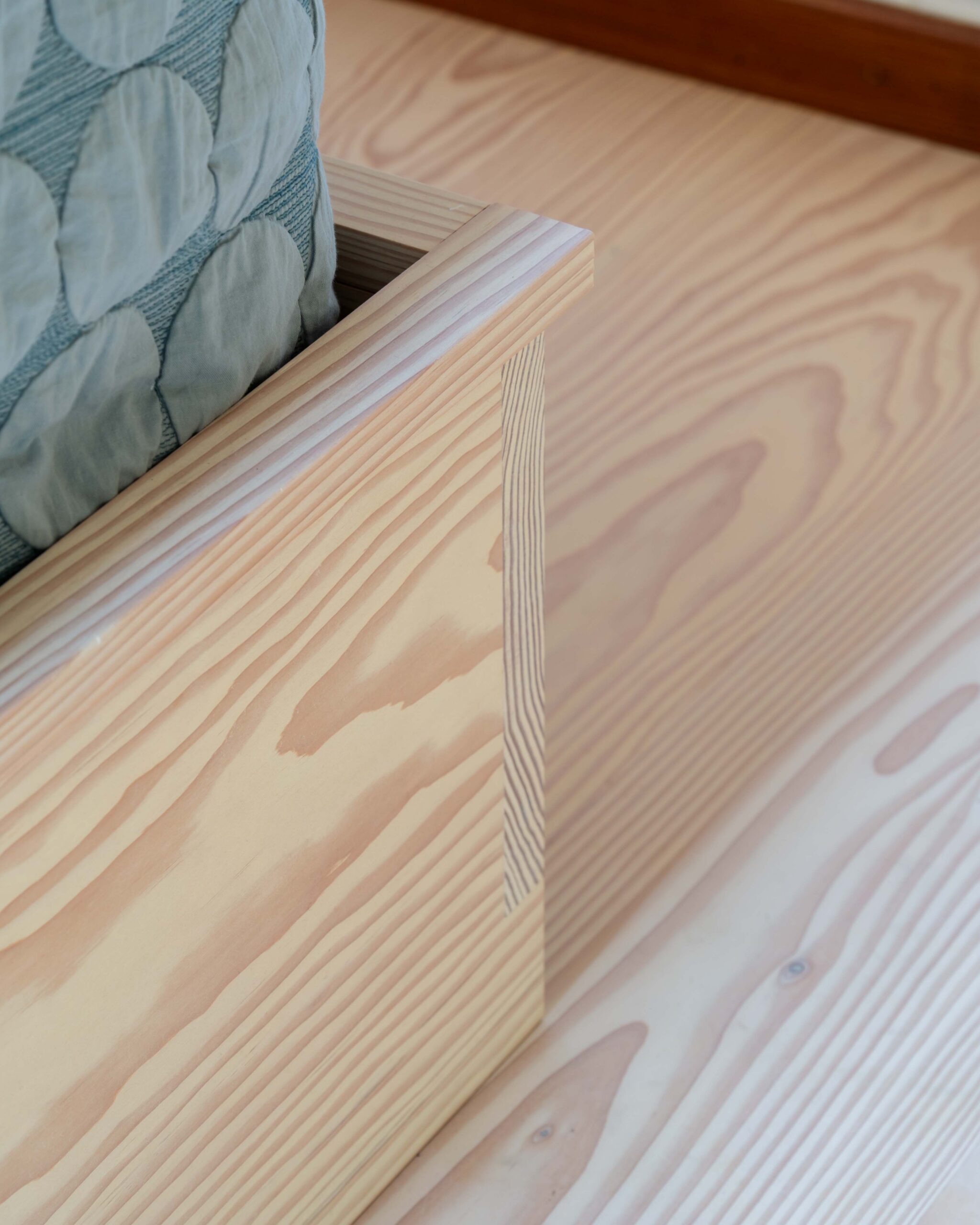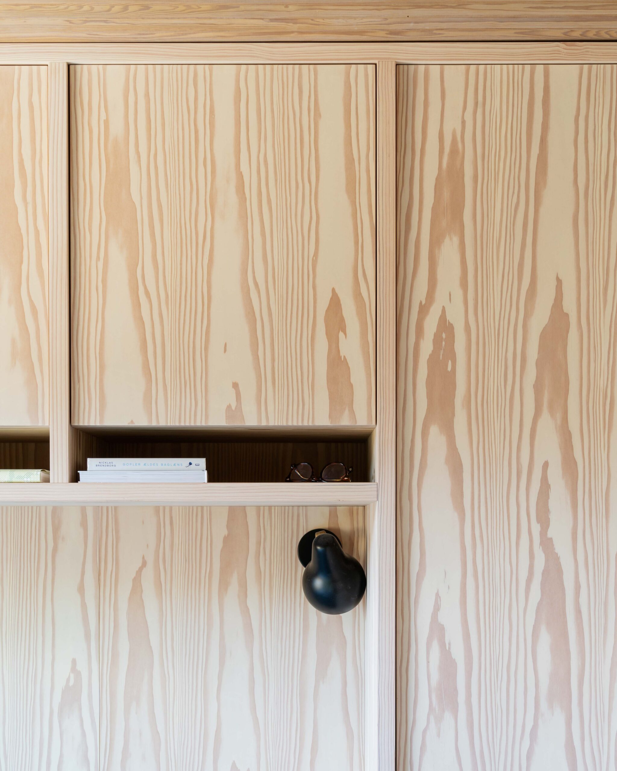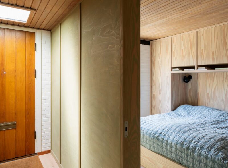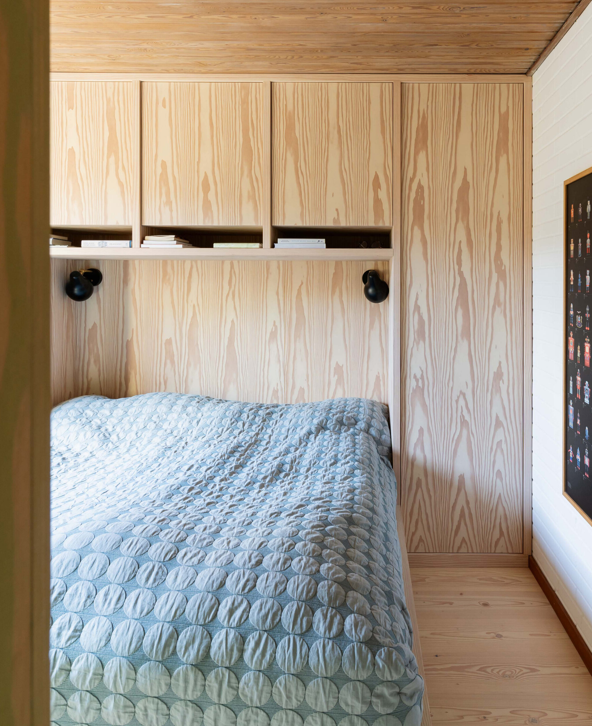 Et andet eksempel er garderoben, sengerammen og det indbyggede skab i soveværelset, hvor snedkerfirmaet CPH WOOD og arkitekterne har tegnet og udviklet møblerne i Douglastræ.